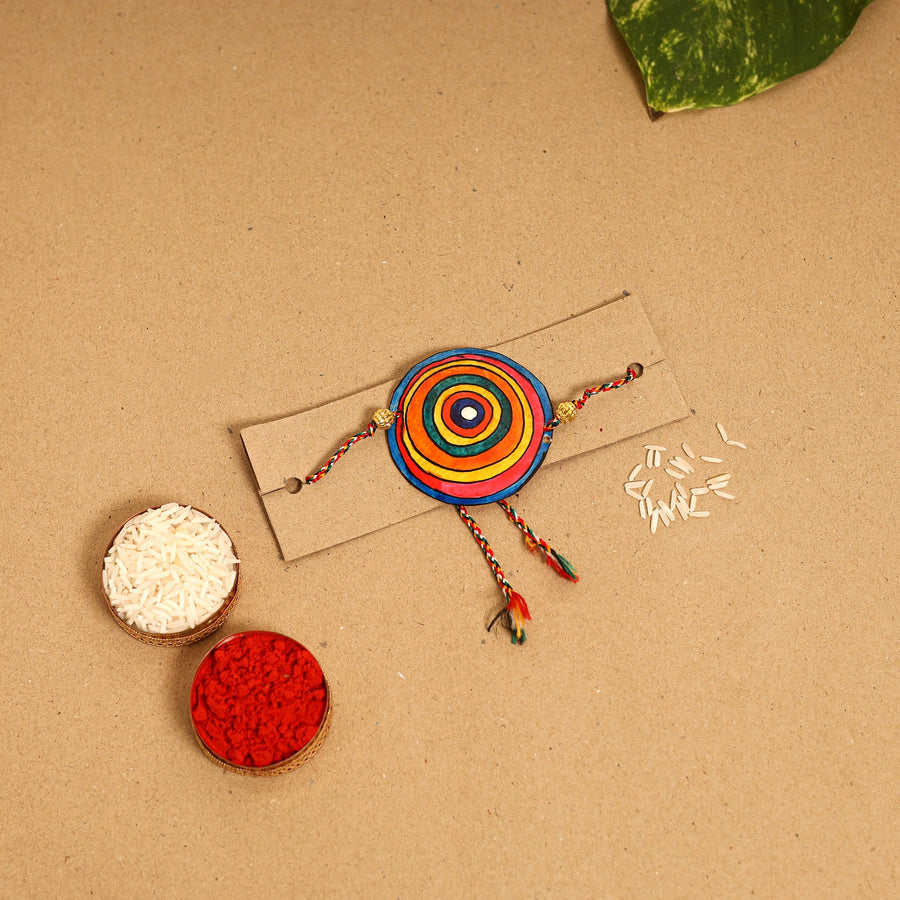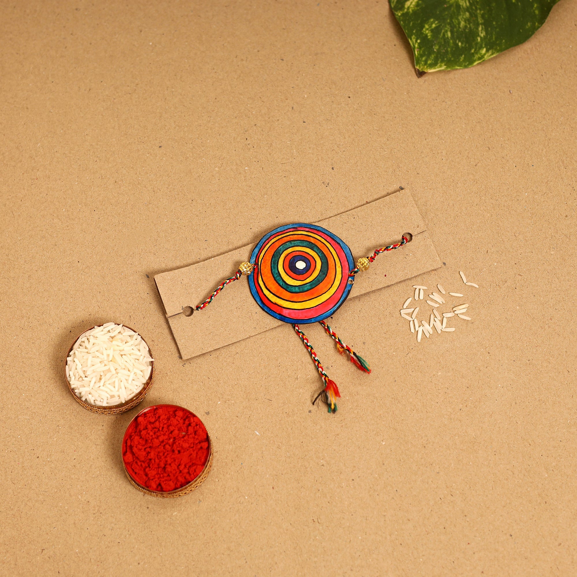 Celebrate the joyous festival of Raksha Bandhan with our hand-painted tholu bommalata leather and thread Rakhi, a true masterpiece handcrafted by Andhra Pradesh's skilled artisans. Each Rakhi is meticulously hand-painted with intricate designs, showcasing the rich cultural heritage. The process involves meticulous leather preparation, hand-painting using traditional colors, and utmost attention to detail, resulting in a unique and meaningful Rakhi that celebrates the spirit of brotherhood. Embrace artistry and tradition with this exceptional Rakhi.By Purchasing a rakhi from iTokri, you have proudly associated yourself with our artisan support initiative, which brings happiness to more than 10,000 families across India. Thanks so much!