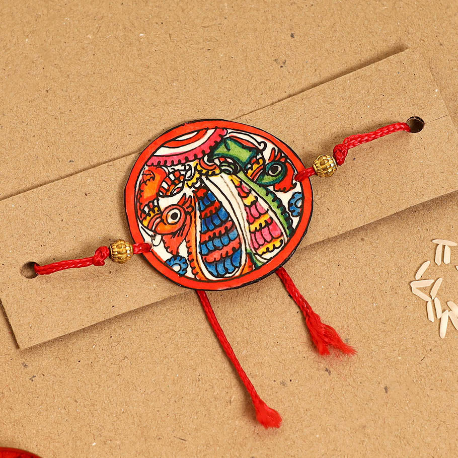 Celebrate the joyous festival of Raksha Bandhan with our hand-painted tholu bommalata leather and thread Rakhi, a true masterpiece handcrafted by Andhra Pradesh's skilled artisans. Each Rakhi is meticulously hand-painted with intricate designs, showcasing the rich cultural heritage. The process involves meticulous leather preparation, hand-painting using traditional colors, and utmost attention to detail, resulting in a unique and meaningful Rakhi that celebrates the spirit of brotherhood. Embrace artistry and tradition with this exceptional Rakhi.By Purchasing a rakhi from iTokri, you have proudly associated yourself with our artisan support initiative, which brings happiness to more than 10,000 families across India. Thanks so much!