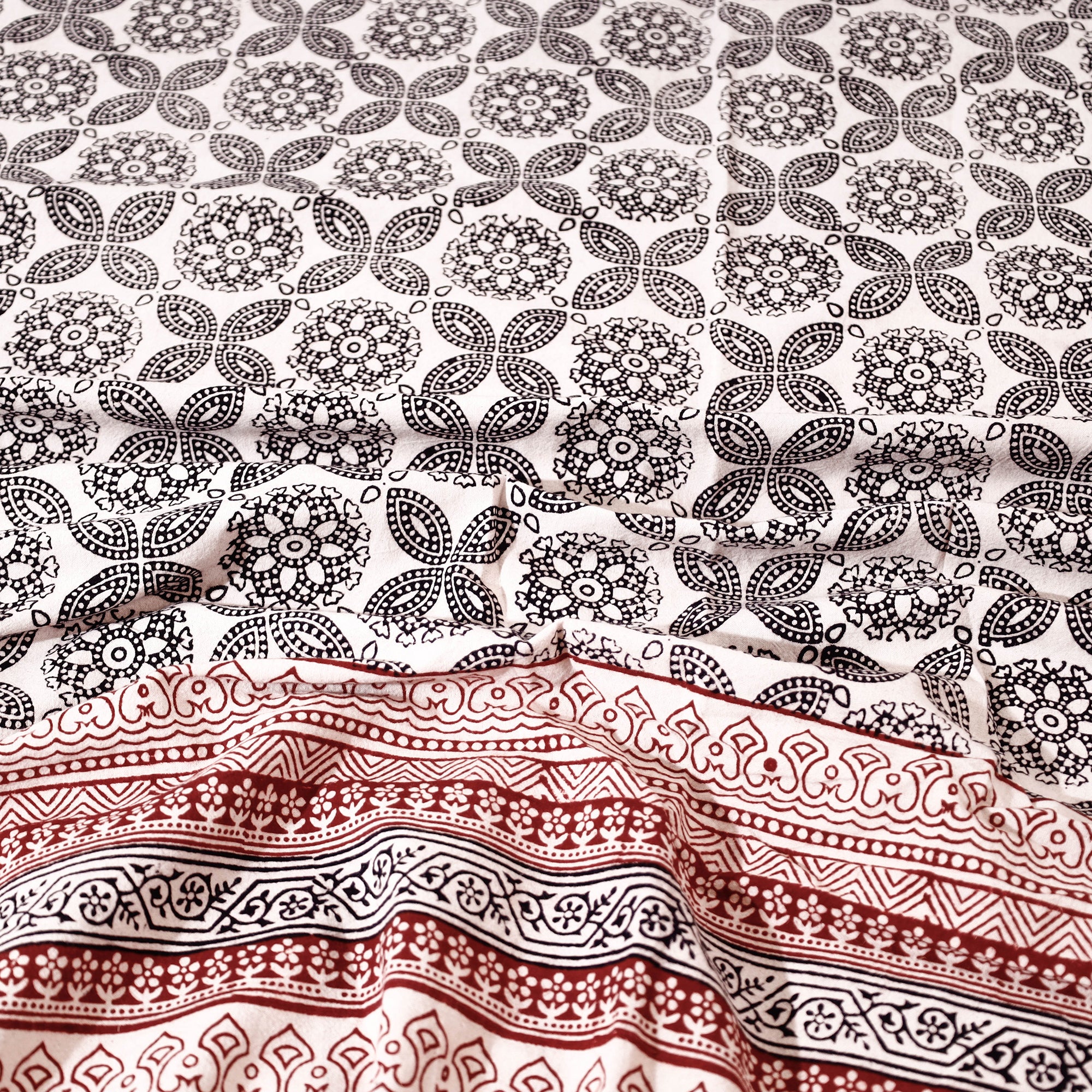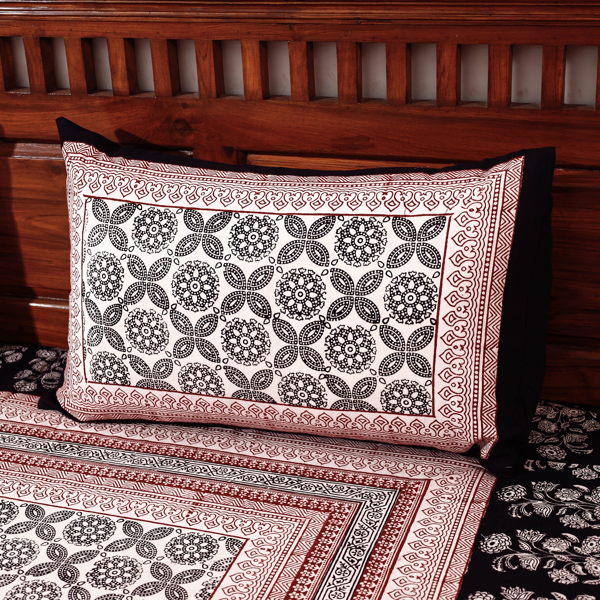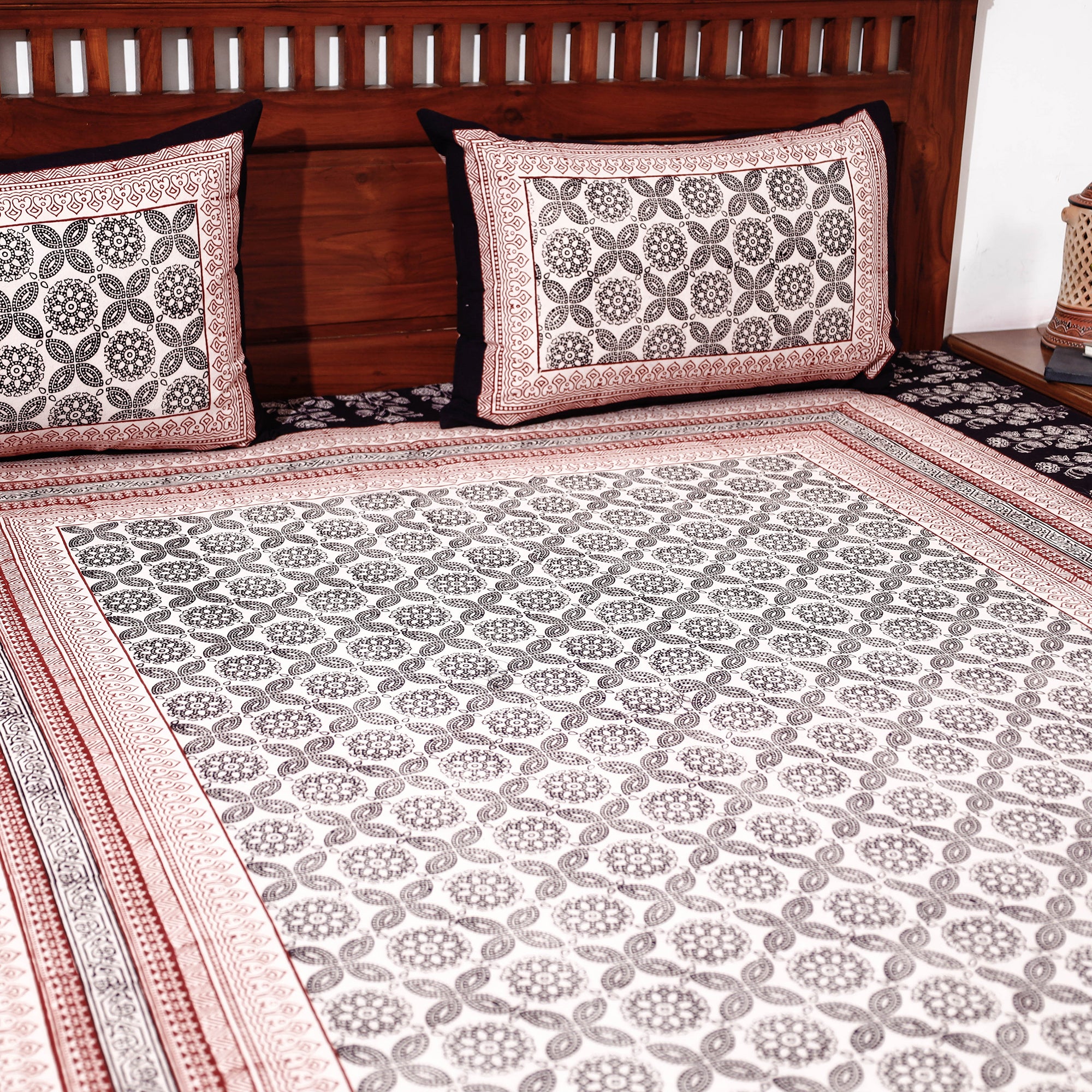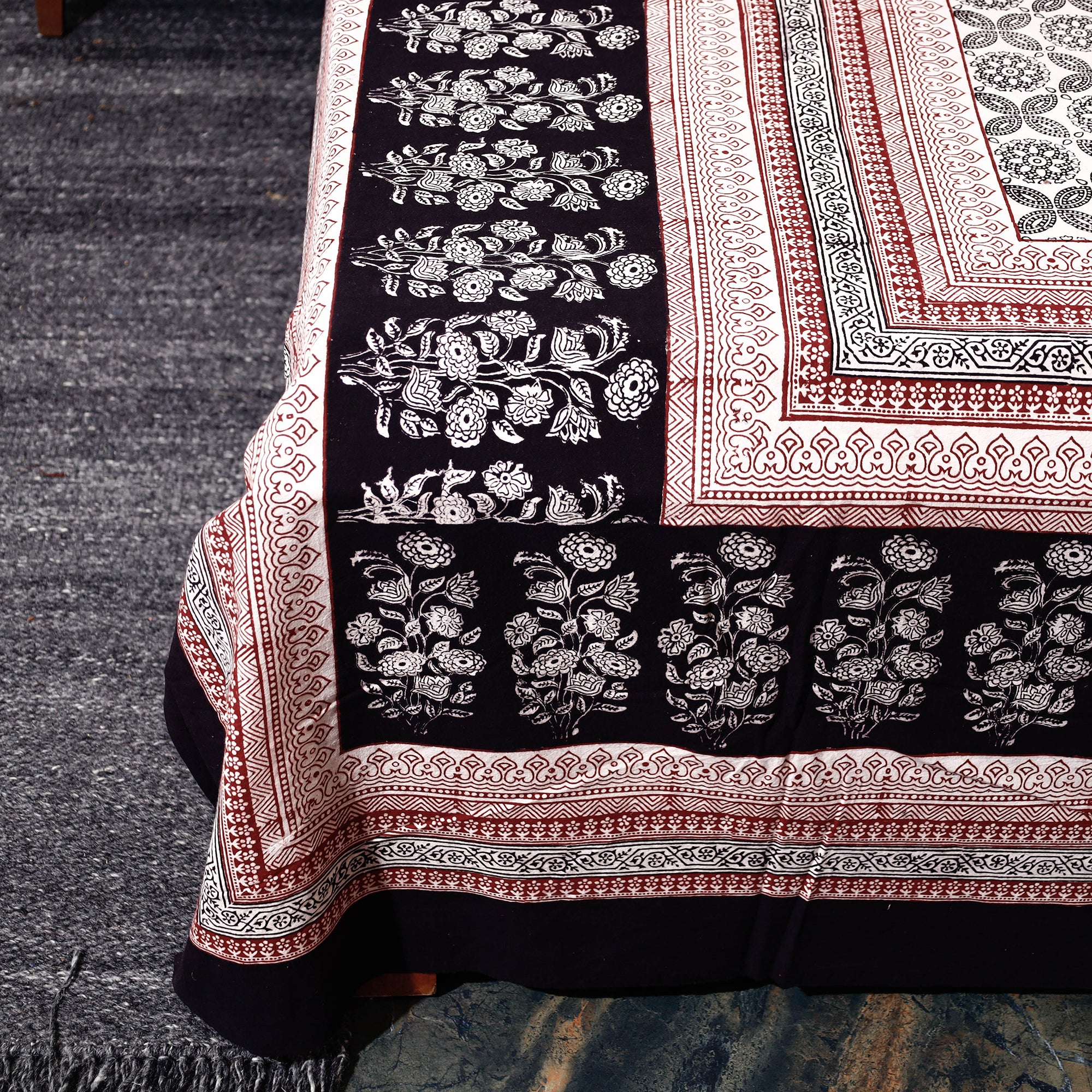 Fine quality black bagh block printed cotton double bed cover with pillow covers, made using natural dyes through traditional processes by master artisan practiced in Bagh, the Dhar district of Madhya Pradesh.