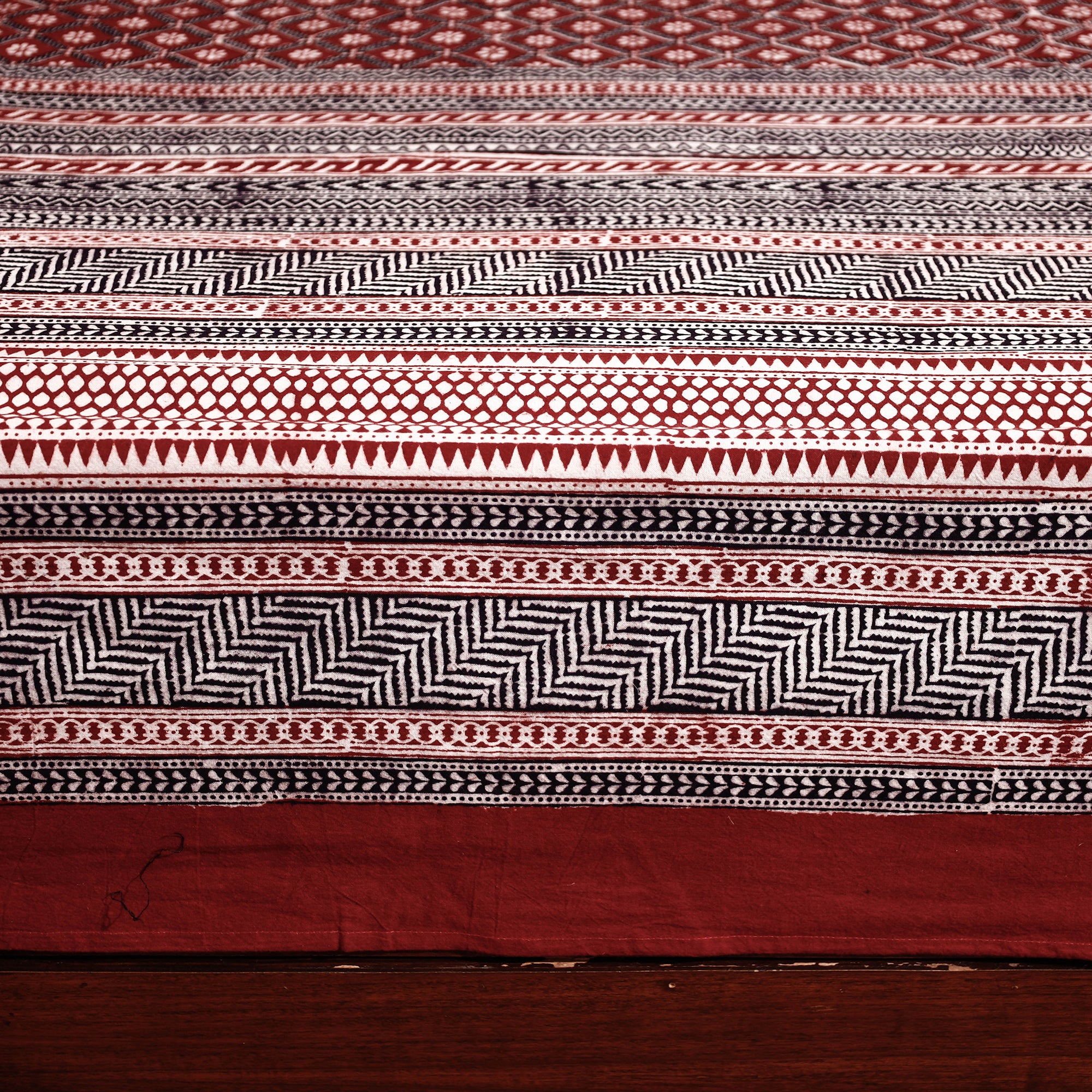 Fine quality bagh block printed cotton double bed cover with pillow covers, made using natural dyes through traditional processes by master artisan practiced in Bagh, the Dhar district of Madhya Pradesh.
