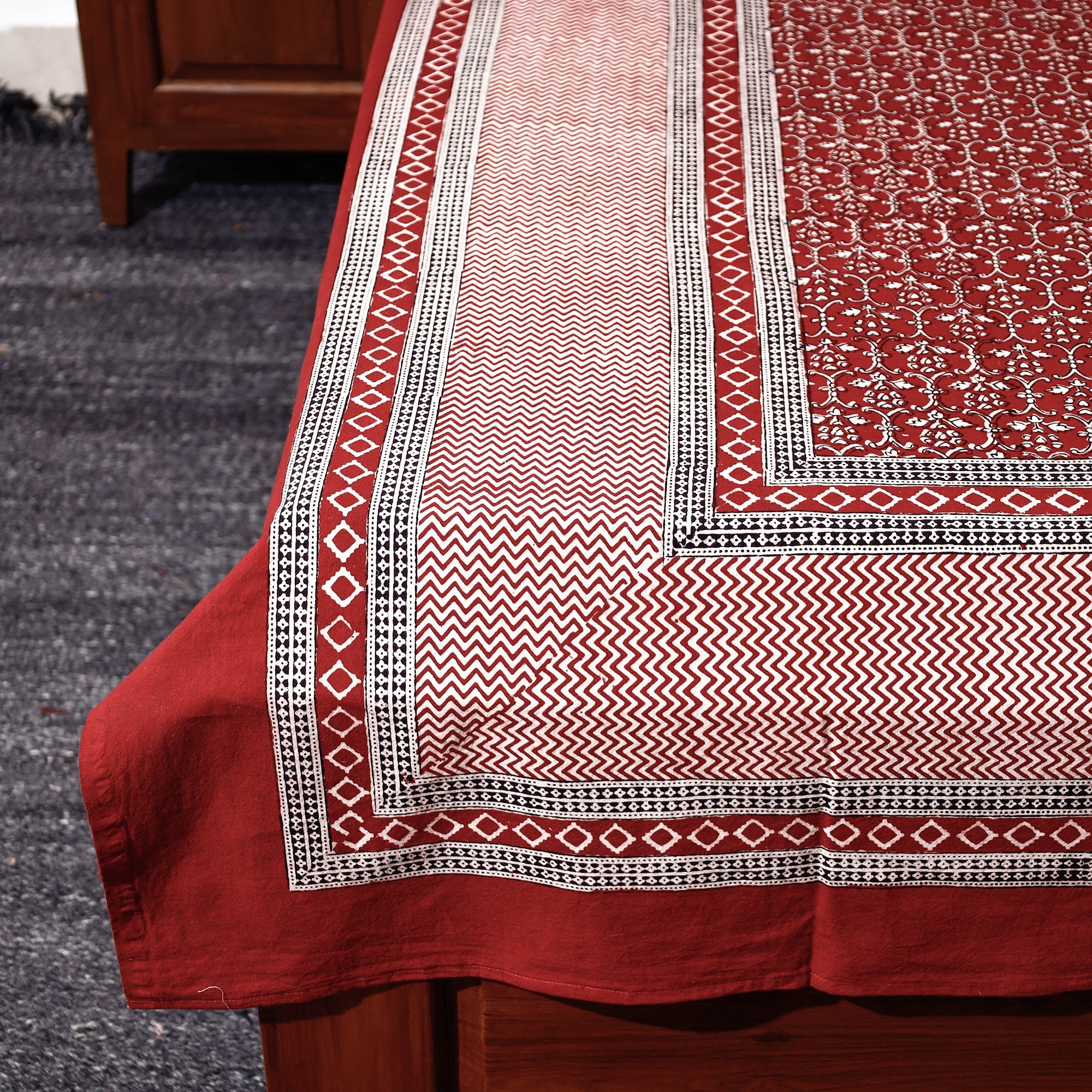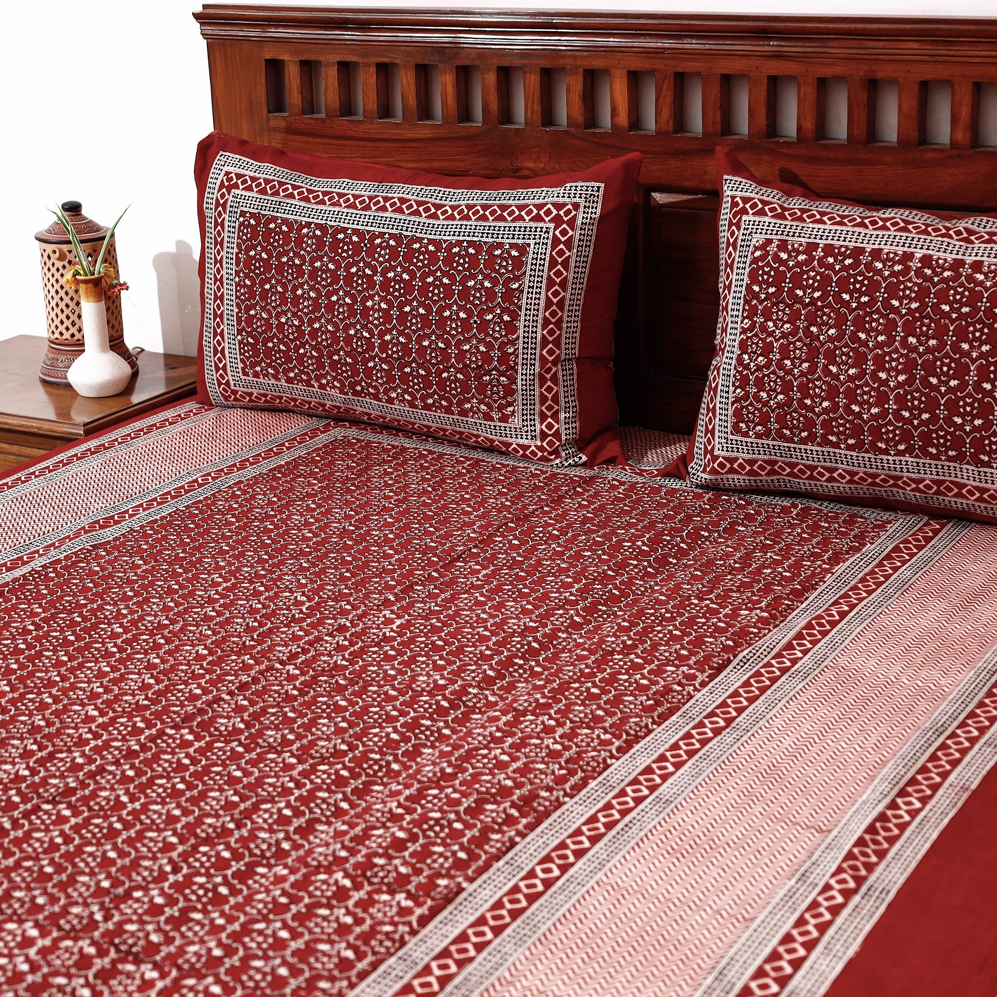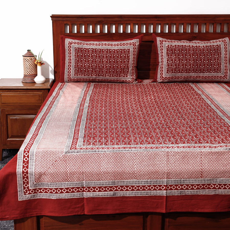 Fine quality bagh block printed cotton single bed cover with pillow covers, made using natural dyes through traditional processes by master artisan practiced in Bagh, the Dhar district of Madhya Pradesh.