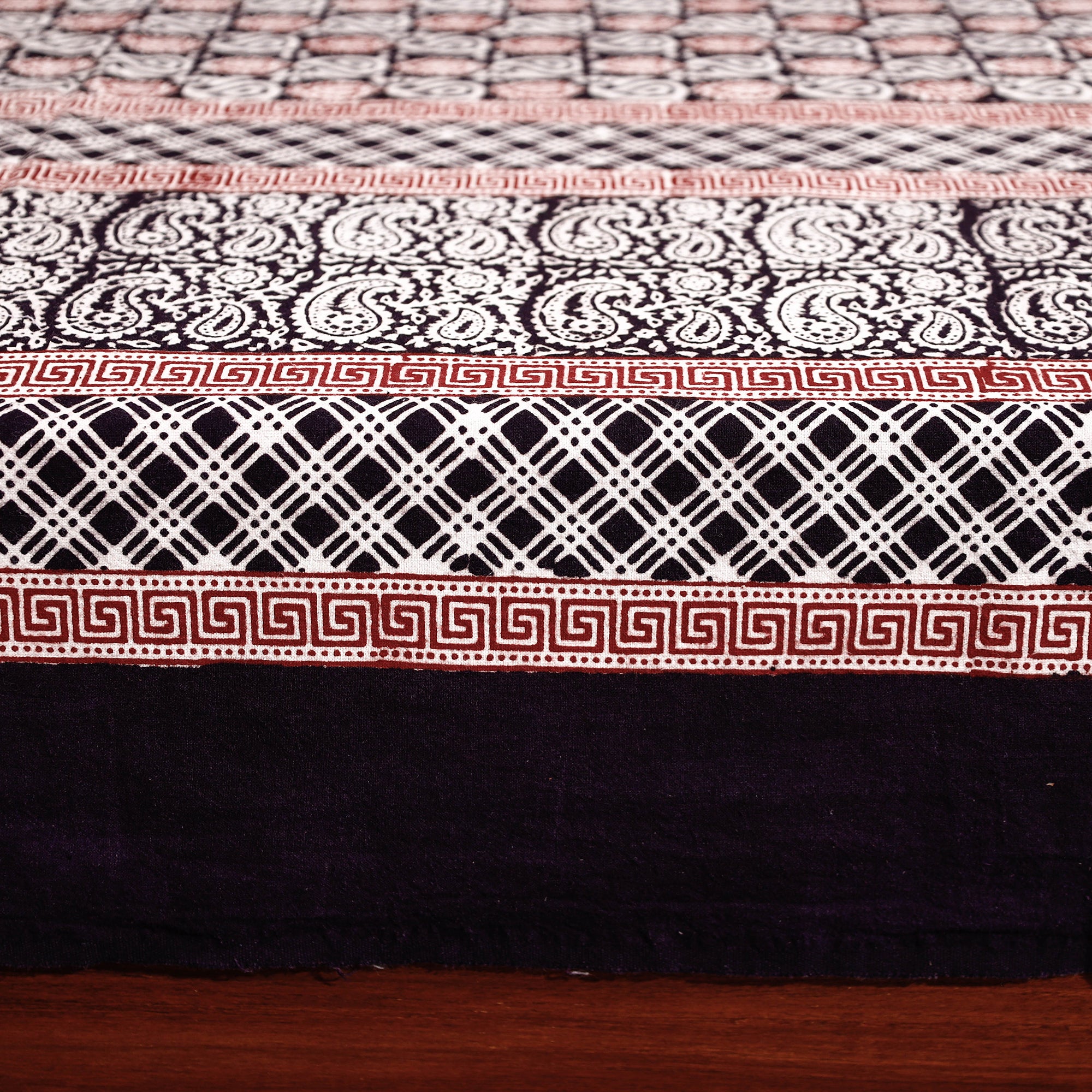 Fine quality black bagh block printed cotton single bed cover with pillow covers, made using natural dyes through traditional processes by master artisan practiced in Bagh, the Dhar district of Madhya Pradesh.