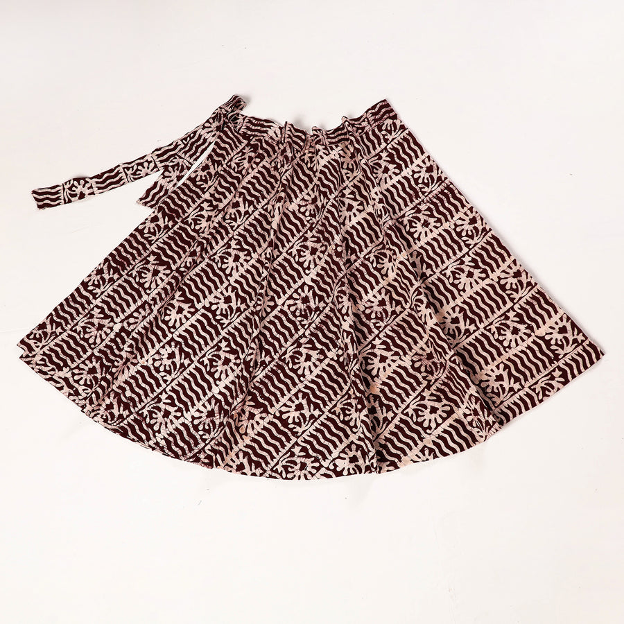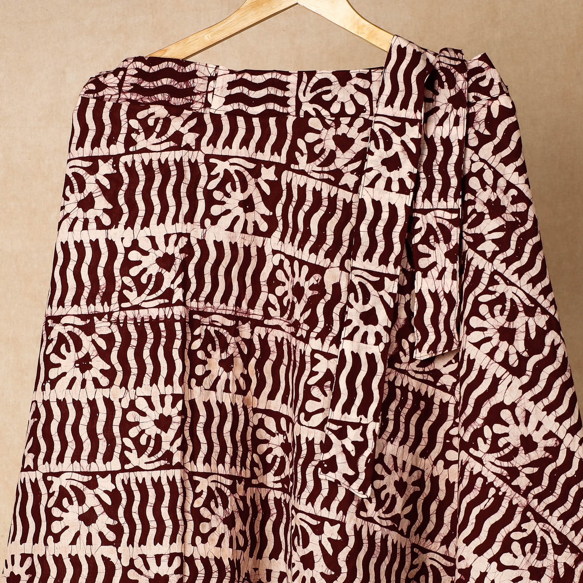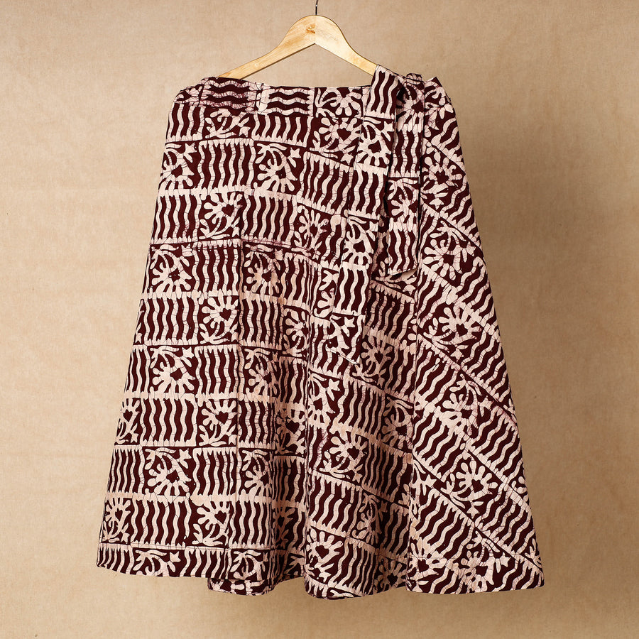 Fine quality brown hand batik printed cotton wrap around skirt featuring a waist tie up closure. Batik is a technique of wax-resist dyeing applied to whole cloth, or cloth made using this technique. The traditional designs and motifs in Indian batik are often passed down from one generation to another.