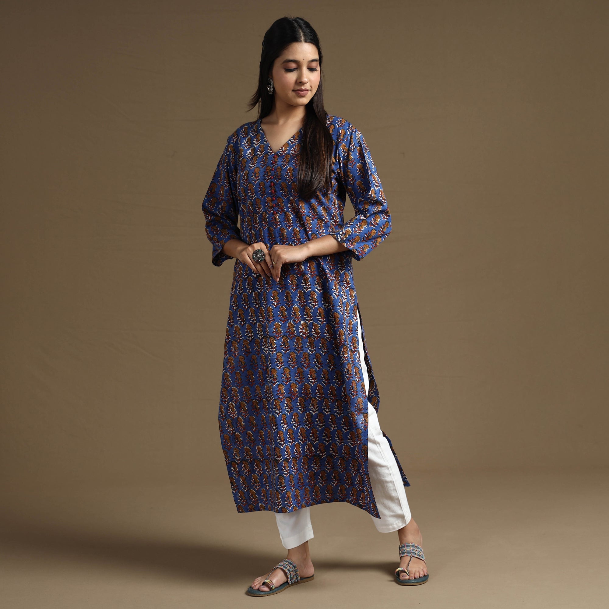 Fine quality bagru hand block printed cotton long kurta, made using naturally dyed cotton fabric through the traditional mud resist process by using hand carved wooden blocks practised in Bagru, Rajasthan, this kurta features intricate patterns created by hand-carved wooden blocks. With a side pocket for added convenience, this kurta is both stylish and practical. Perfect for any occasion, its lightweight cotton fabric ensures comfort all day long.