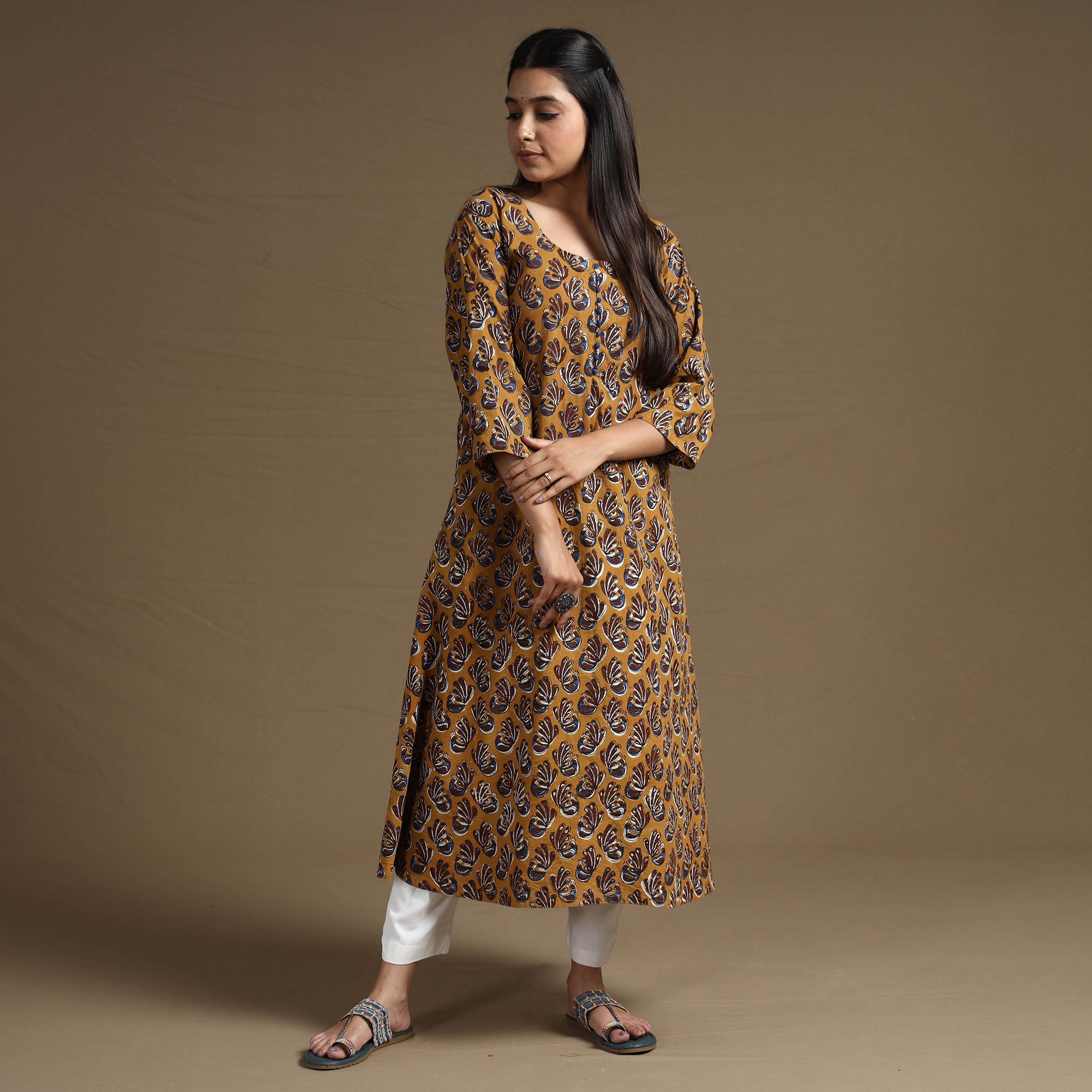 This brown bagru hand block printed kurta is crafted from naturally dyed cotton fabric using the traditional mud-resist technique practiced in Bagru, Rajasthan. Intricate patterns are created by skilled artisans with finely carved wooden blocks. Featuring a convenient side pocket, this straight kurta blends style with practicality. Perfect for any occasion, its lightweight cotton ensures all-day comfort.
