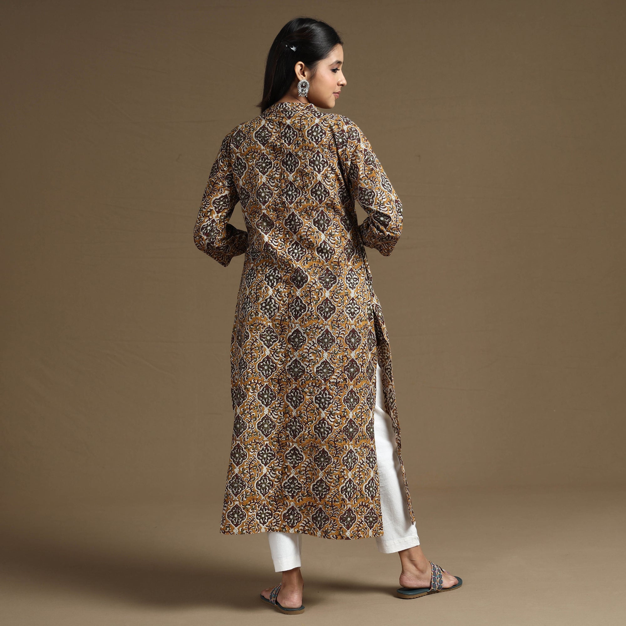 Fine quality bagru hand block printed cotton long kurta, made using naturally dyed cotton fabric through the traditional mud resist process by using hand carved wooden blocks practised in Bagru, Rajasthan, this kurta features intricate patterns created by hand-carved wooden blocks. With a side pocket for added convenience, this kurta is both stylish and practical. Perfect for any occasion, its lightweight cotton fabric ensures comfort all day long.