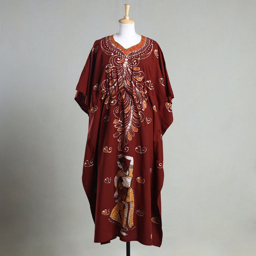 Fine quality hand batik print cotton long kaftan. Batik is a technique of wax-resist dyeing applied to whole cloth, or cloth made using this technique. The traditional designs and motifs in Indian batik are often passed down from one generation to another. A traditional kaftan or caftan is an ankle-length garment with long, flowing sleeves. It has an adjustable drawstring waist. These loose-fitting cotton kaftans are enhanced by a soft touch and beautiful hand prints. This dress will allow you to move with ease and comfort. The drawstring waist tie will give you the freedom to customize the fit to suit your unique shape.