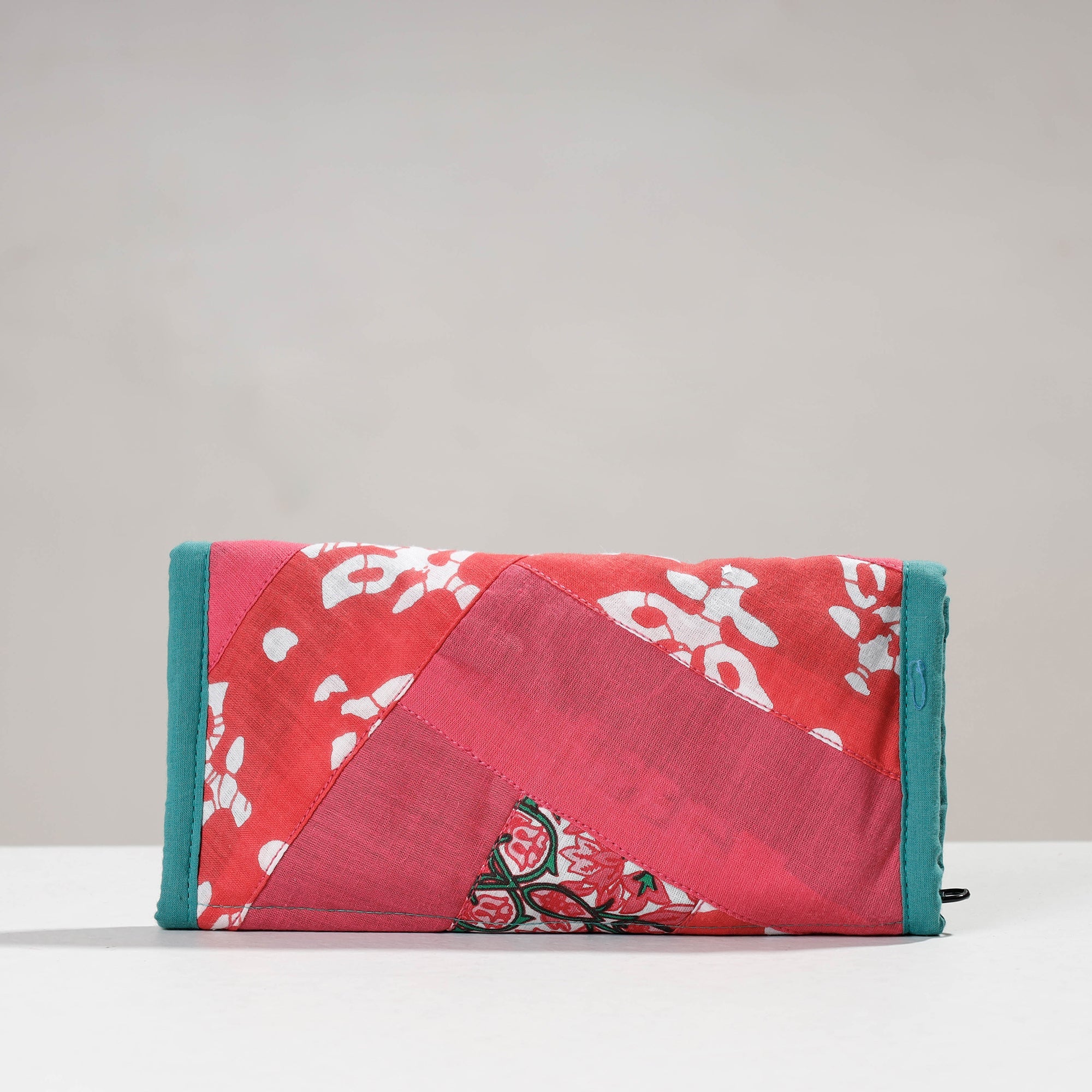 This exquisite handmade pink patchwork cotton two fold clutch wallet by Jugaad. It's carefully crafted from block printed patchwork cotton fabric. The wallet features a spacious cash compartment for bills, three convenient card slots for effortless access to your cards, a secure velcro lock pocket for coins, and a secure zipper pocket to keep your valuables safe. Experience the perfect blend of style and functionality with this charming accessory while also supporting traditional artisanal craftsmanship.