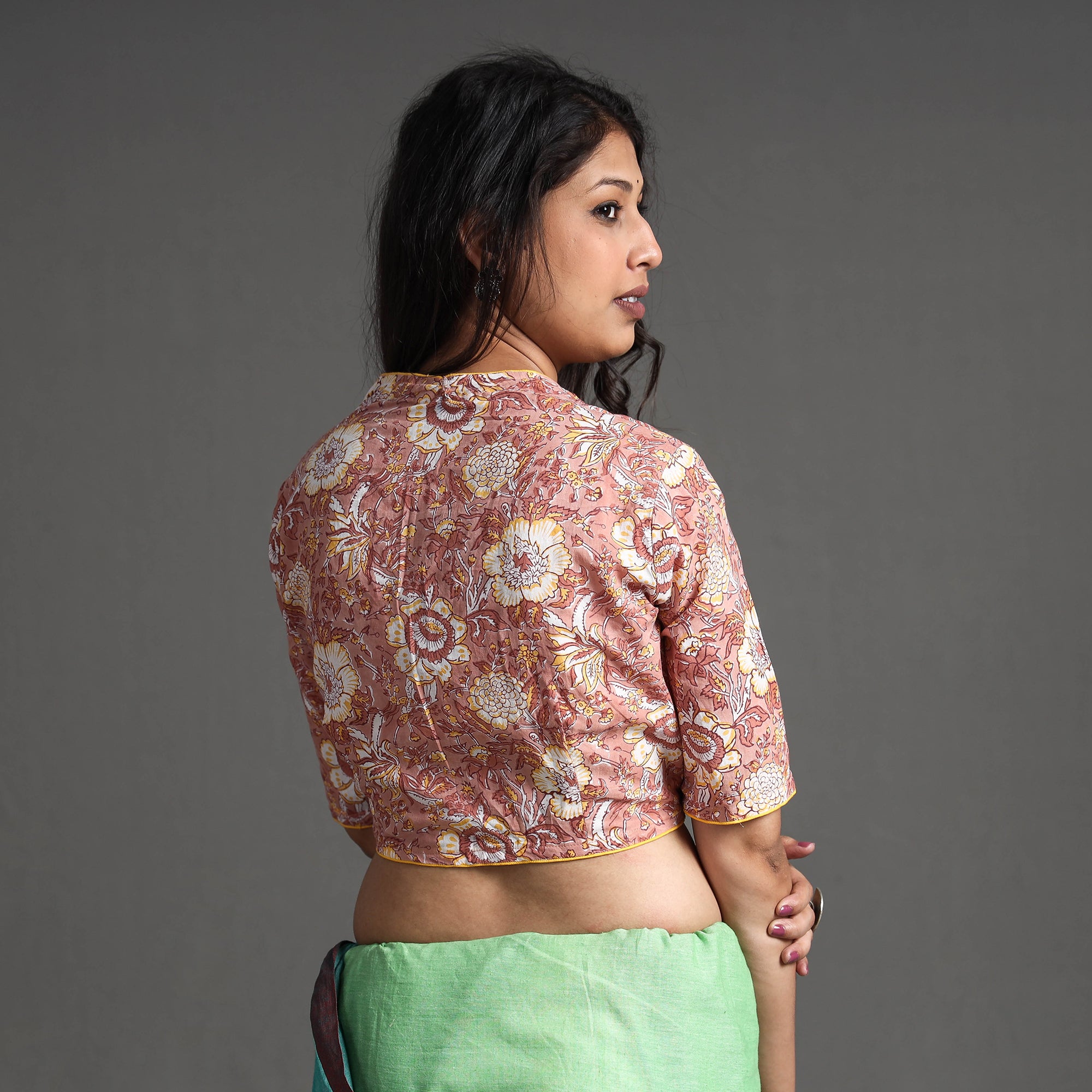 This exquisite peach sanganeri hand block printed cotton stitched blouse is crafted with fine quality cotton fabric, ensuring comfort and breathability throughout the day. It features elegant half sleeves that provide balanced coverage, making it perfect for any occasion. The hook lock adds convenience and allows for easy wear and removal. With its intricate block printed floral motifs, this blouse adds a touch of cultural charm to your outfit.