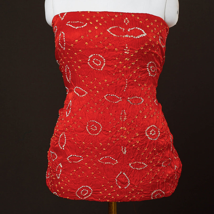 Finest Kutch Bandhani Tie-Dye Modal Silk Lagdi Patta 3-Piece Suit Material Set, perfect for elevating your ethnic wear. Skillfully handcrafted by artisans from Kutch, this set showcases the majestic bandhani pattern, created using the traditional tie-dye technique. The exquisite combination of modal silk lends a luxurious feel to the ensemble, making it a statement piece for any occasion.