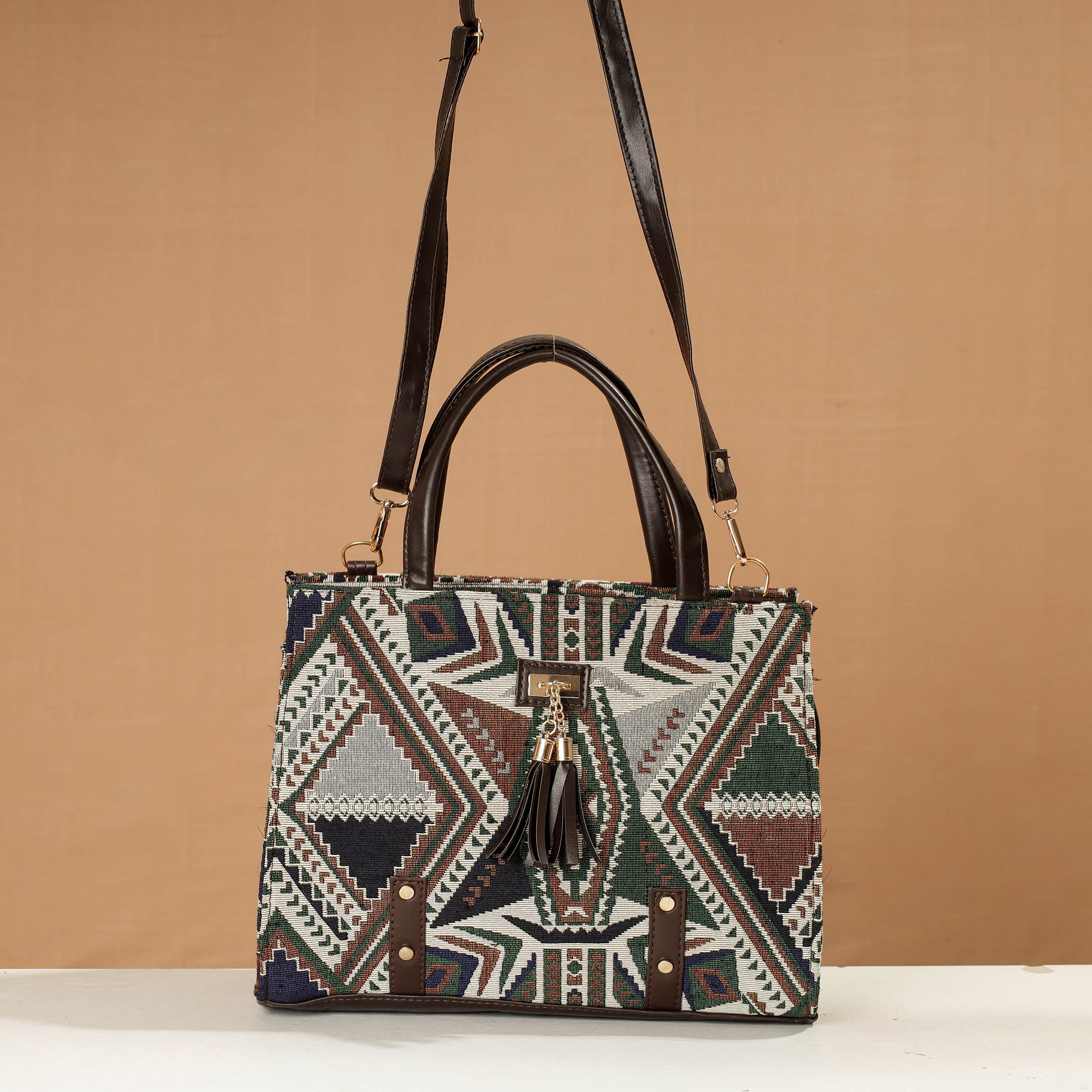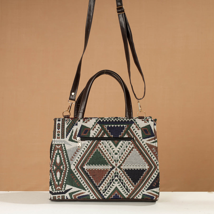 This multicolor handcrafted handbag with a detachable sling and one small clutch bag is made from durable and eco-friendly rexine and screen-printed fabric. It has one zipper pocket on the outside. This bag provides ample space for your essentials.