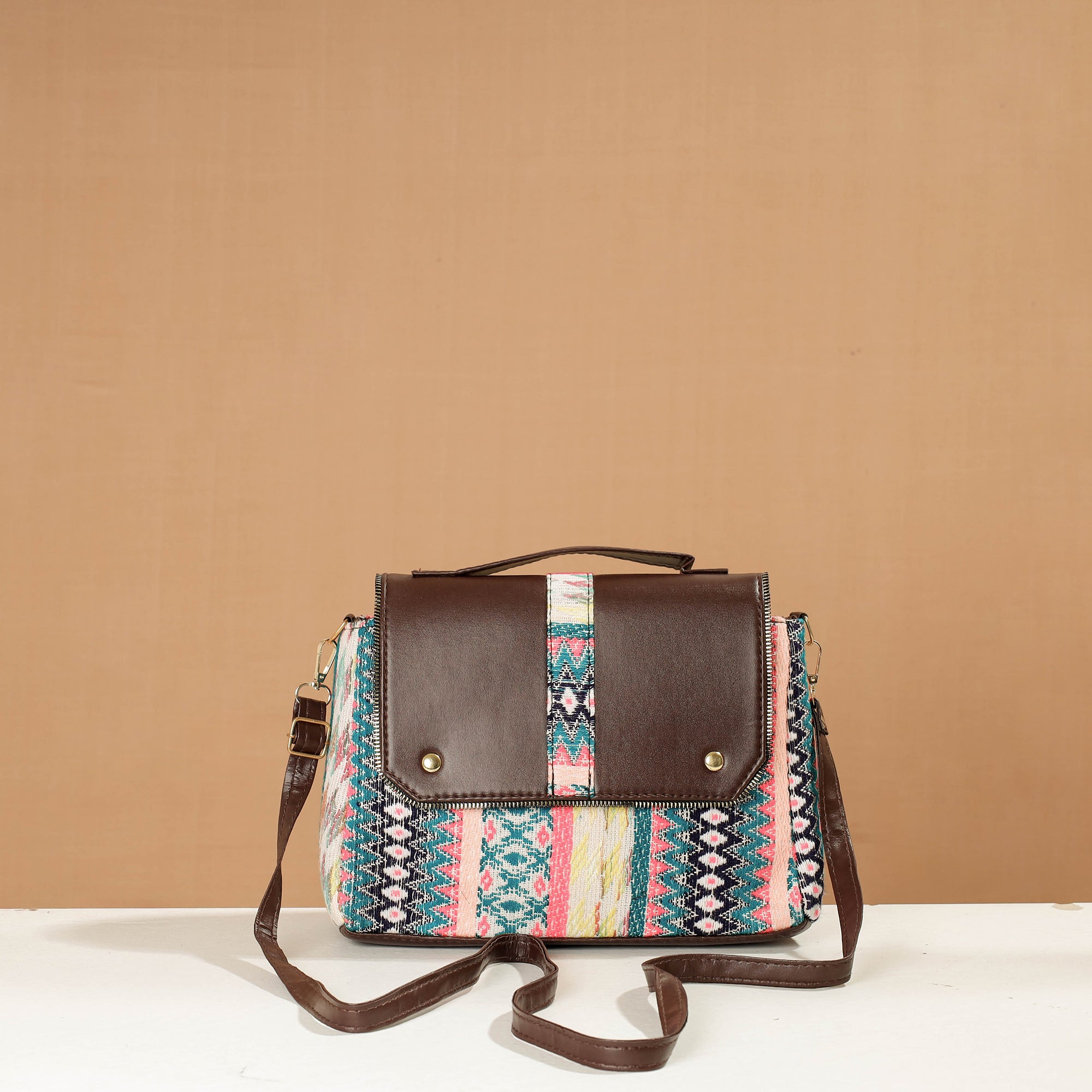 This multicolor handcrafted sling bag with detachable sling is made from durable and eco-friendly rexine and screen-printed fabric. It has one zipper pocket on the outside. This bag provides ample space for your essentials.