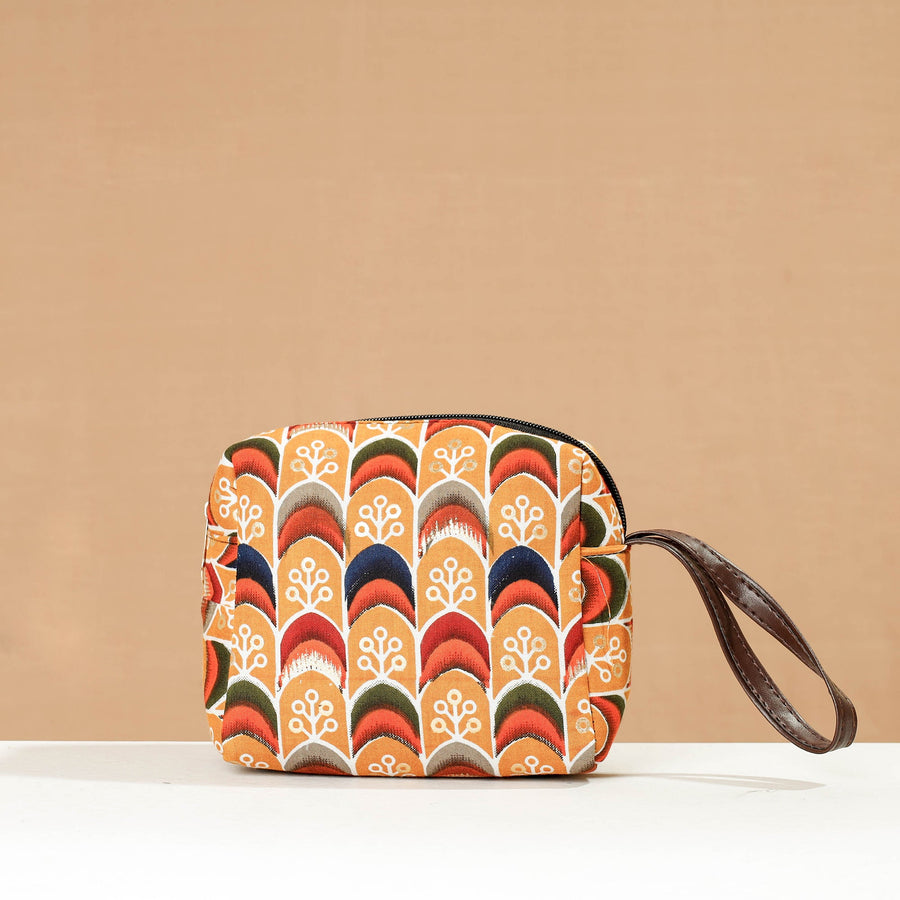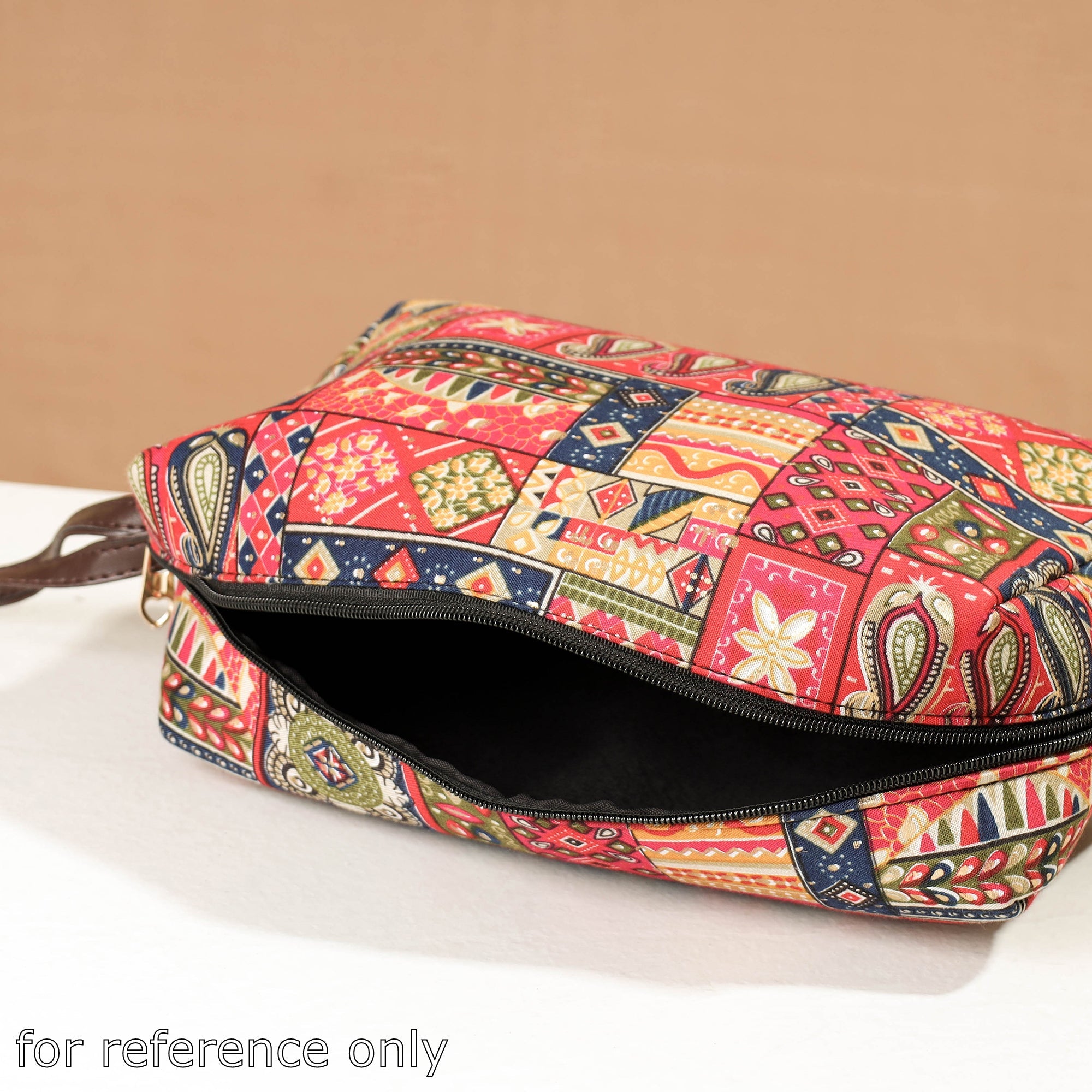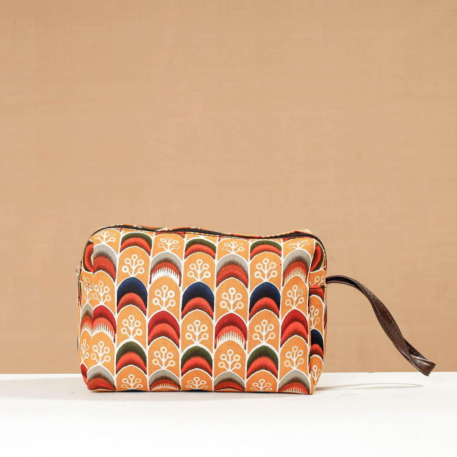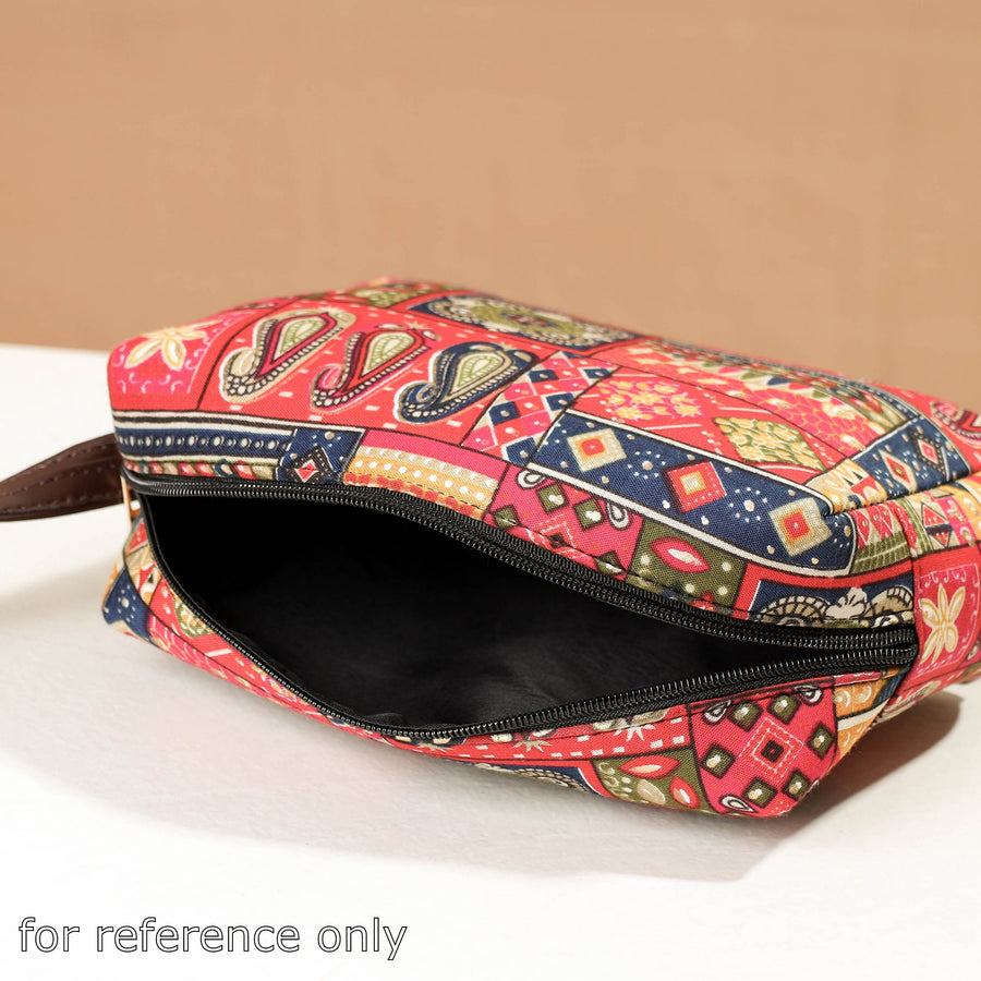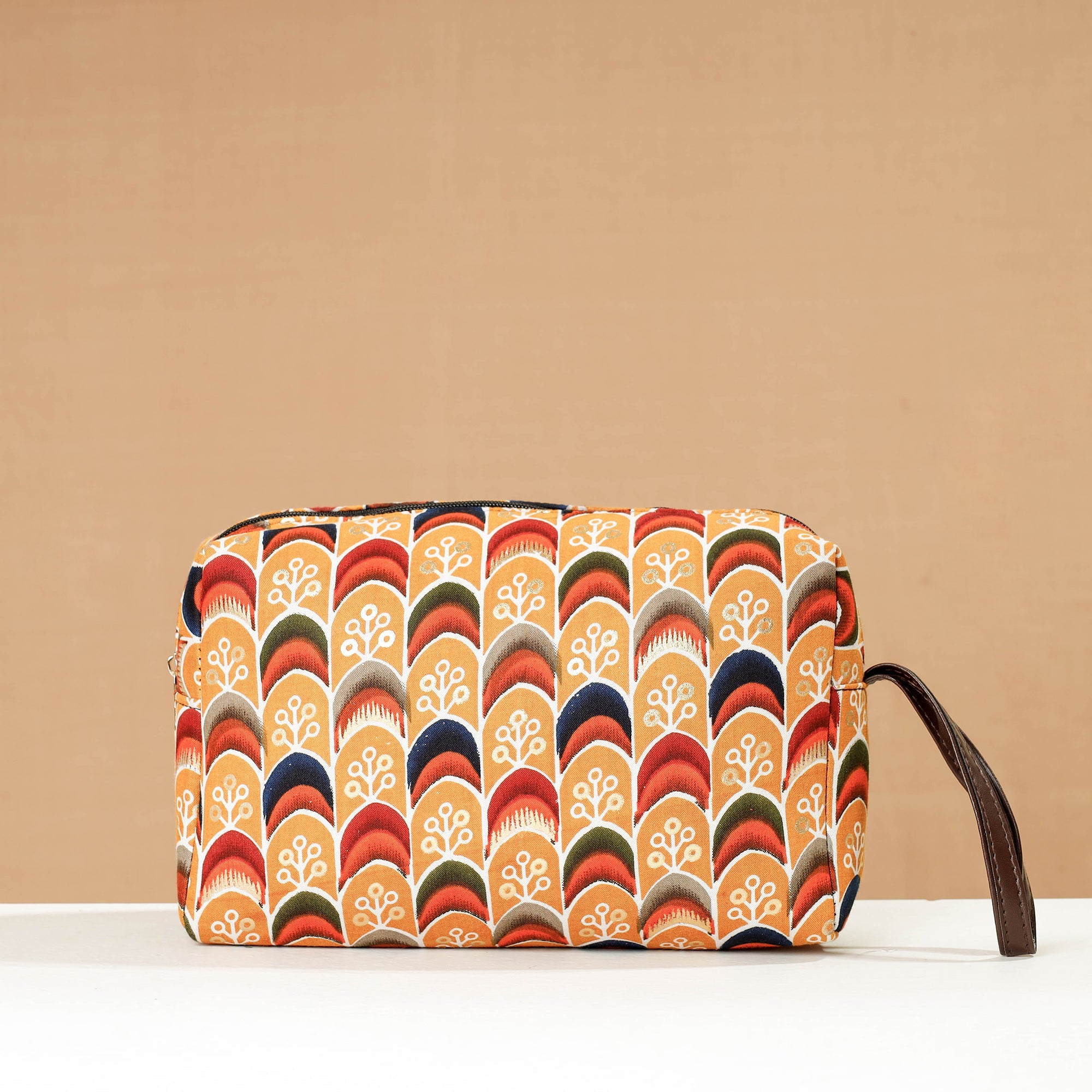 This handcrafted multipurpose cosmetic/toiletry pouch is made from durable and eco-friendly rexine and screen-printed fabric. This bag provides ample space for your essentials.