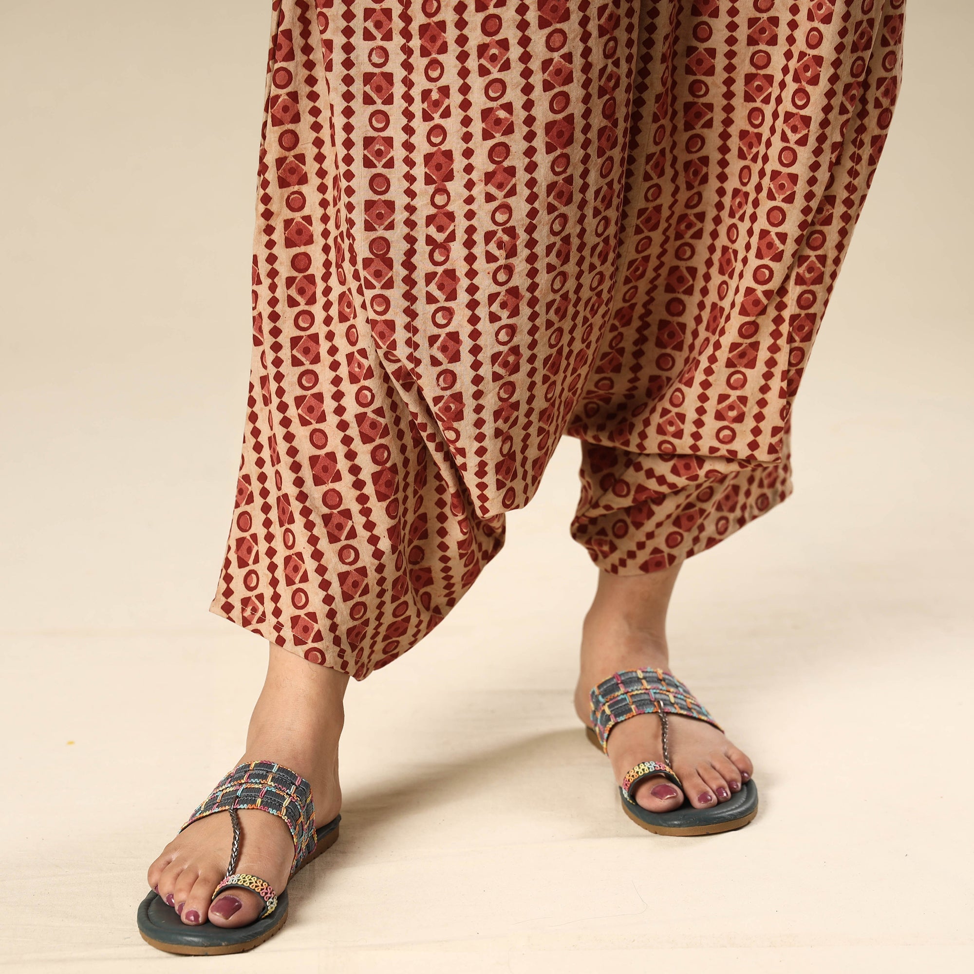 Stay comfortable and stylish in this kalamkari hand block-printed cotton harem pant. Made from naturally dyed cotton fabric. This pant offers the perfect blend of comfort and style. The elasticized waist ensures a great fit, while the two side pockets add functionality. This harem pant makes you feel comfortable and stylish all day long and is perfect for your daily outings and special occasions.