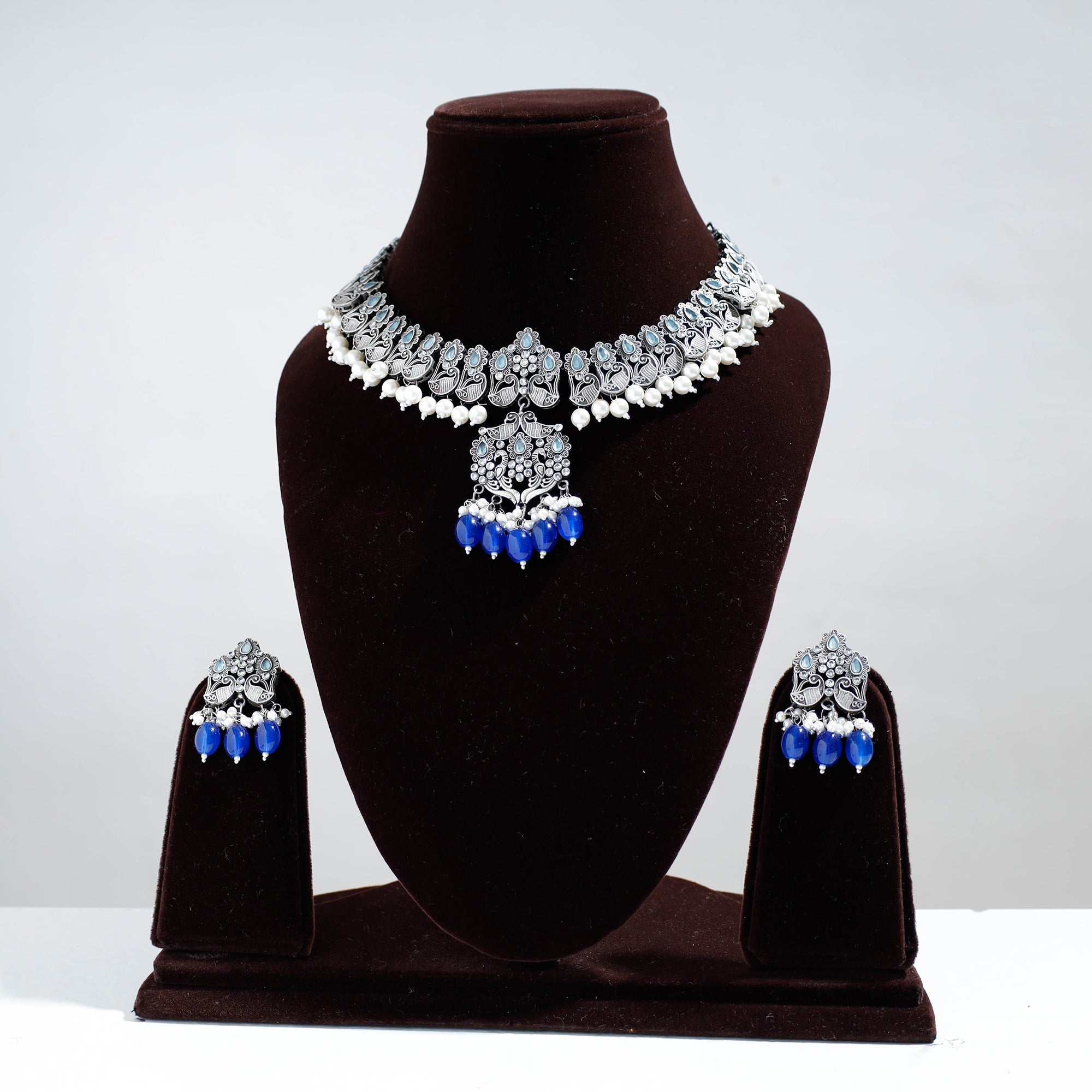 Grey antique silver finish oxidised brass base stone work necklace set, made of high quality oxidised metal with rustic shine effect. Combining vintage charm with contemporary elegance. Dressing up for a special occasion or adding a touch of sophistication to your everyday look, this pendant necklace effortlessly elevates any outfit.