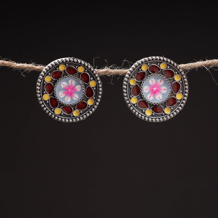 Multicolor antique silver finish oxidised brass base enamel work earrings, made of high-quality oxidised metal with a rustic shine effect. Combining vintage charm with contemporary elegance. Thoughtful and timeless, our earrings make the perfect gift, reflecting your appreciation for their unique style and taste.