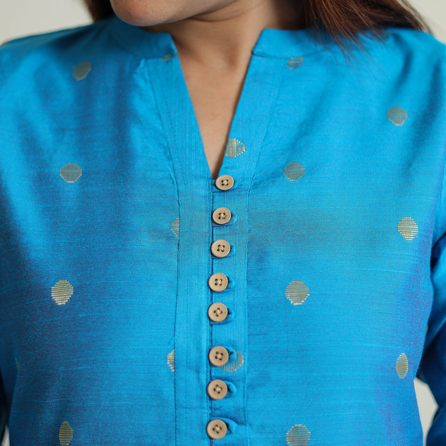 Fine quality polka dot zari buta silk long Kurta with side pocket. This Kurta is made from a high quality viscose and polyester blend. Look and feel beautiful in this uniquely designed polka dot zari buti silk long Kurta. This silk Kurta will keep you comfortable all day. This Kurta is perfect for your daily outing and for a special occasion.