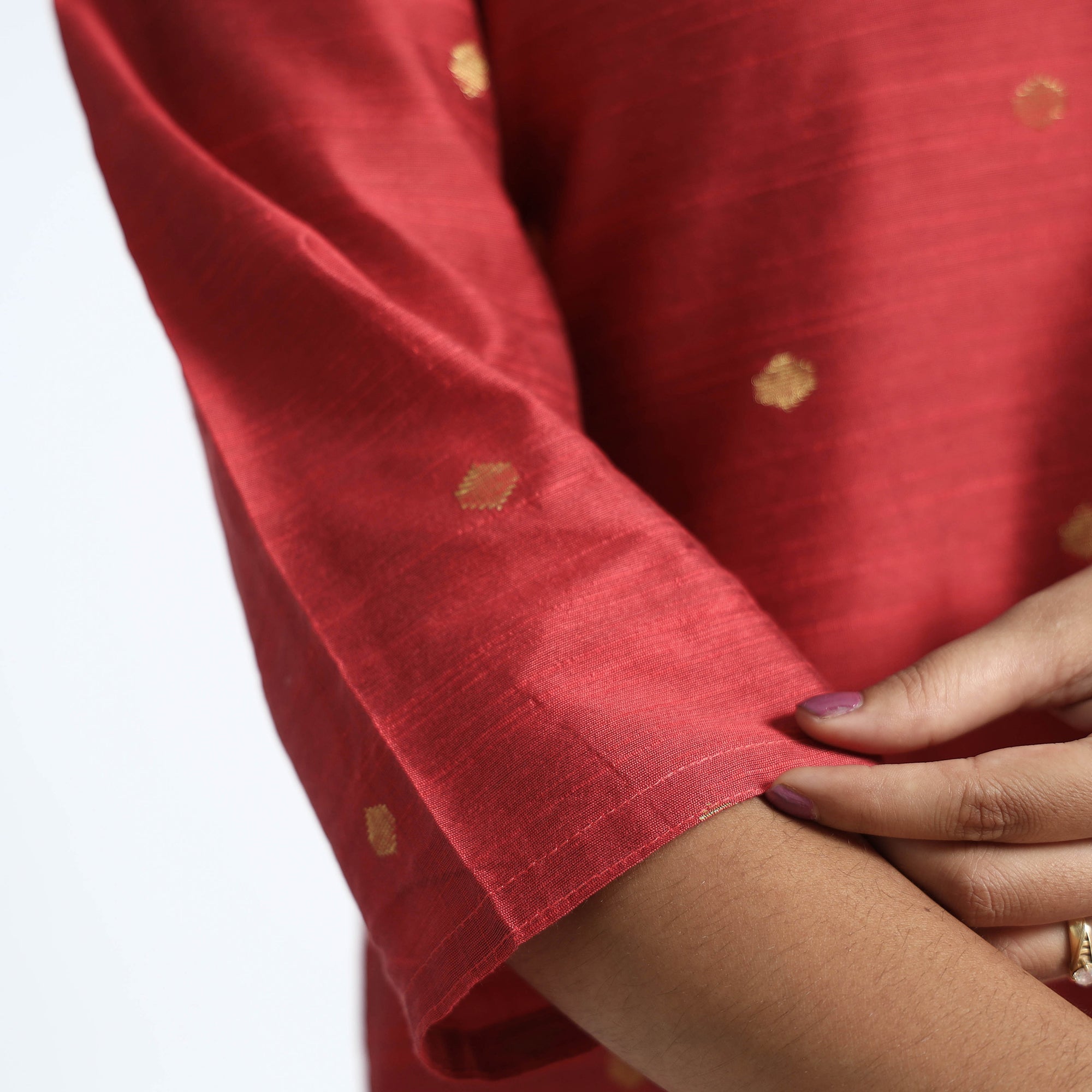 Fine quality polka dot zari buta silk long Kurta with side pocket. This Kurta is made from a high quality viscose and polyester blend. Look and feel beautiful in this uniquely designed polka dot zari buti silk long Kurta. This silk Kurta will keep you comfortable all day. This Kurta is perfect for your daily outing and for a special occasion.