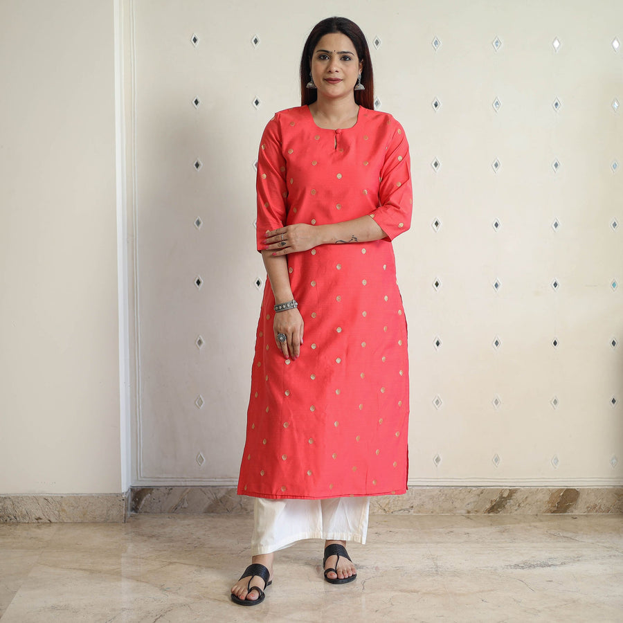 Fine quality red polka dot zari buta silk long kurta with side pocket. This Kurta is made from a high quality viscose and polyester blend. Look and feel beautiful in this uniquely designed polka dot zari buti silk long Kurta. This silk Kurta will keep you comfortable all day. This Kurta is perfect for your daily outing and for a special occasion.