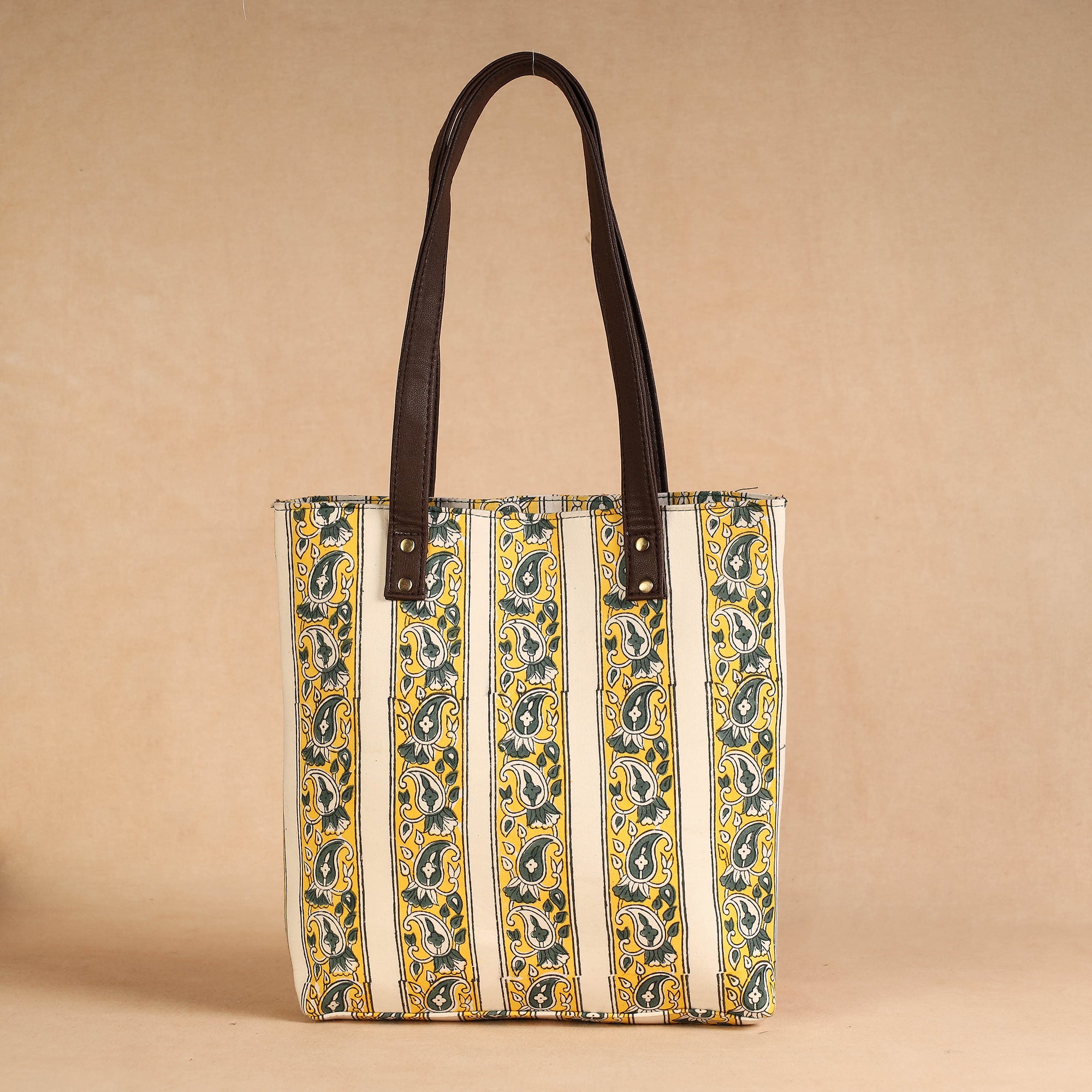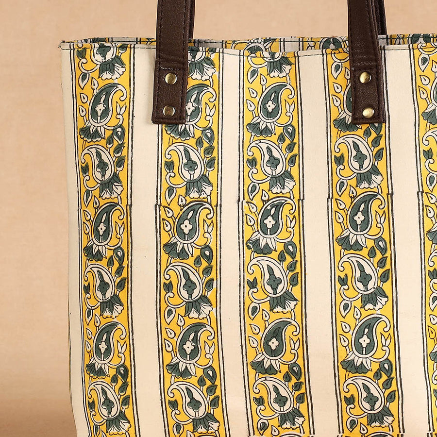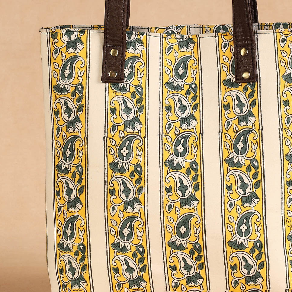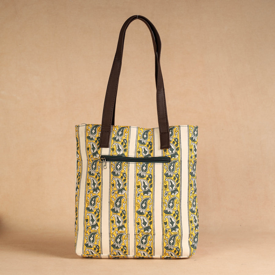 This exquisite yellow sanganeri printed vegan leather shoulder bag is a true testament to artistry and craftsmanship. Handcrafted by skilled craftswomen in Kolkata, West Bengal, this bag showcases the timeless beauty of sanganeri block printed cotton fabric with vegan leather handle. It offers ample space to accommodate most of your essentials. With one convenient zipper pocket inside and another outside, this bag effortlessly combines functionality with fashion.