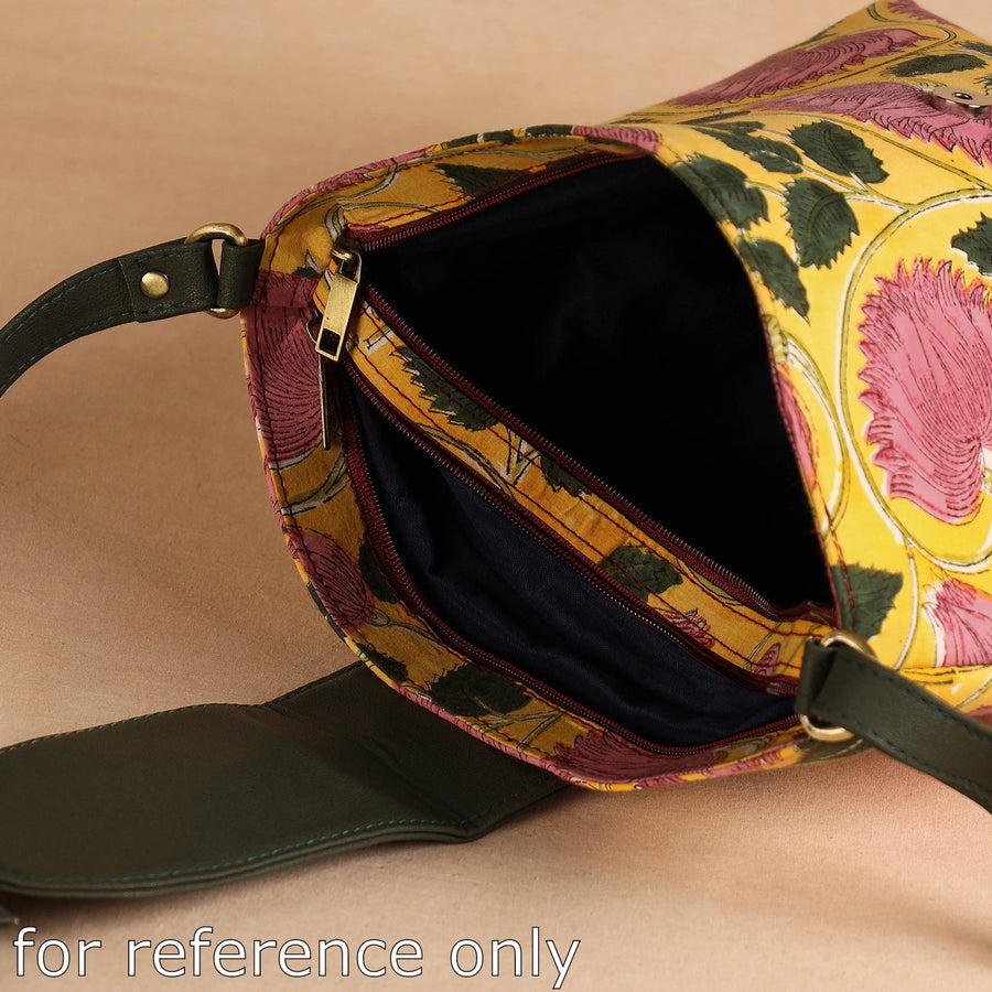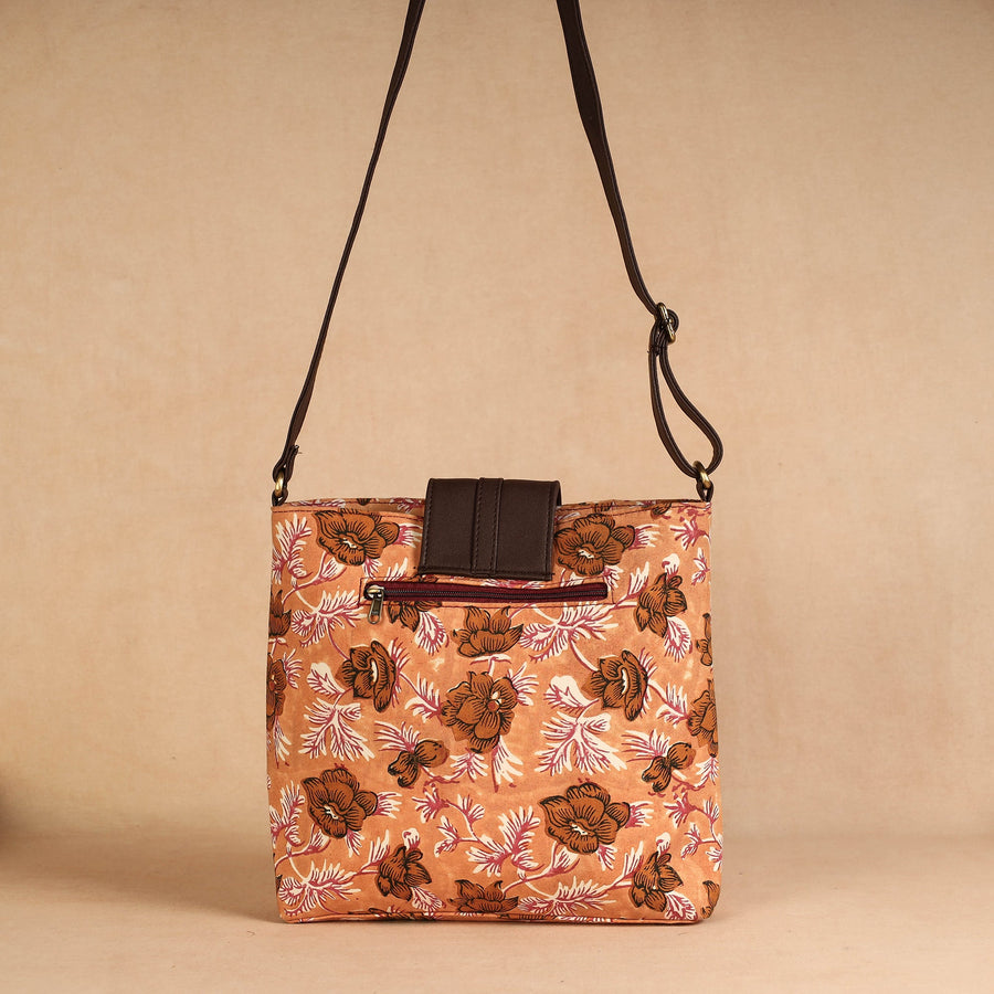 This exquisite brown sanganeri printed vegan leather sling bag is a true testament to artistry and craftsmanship. Handcrafted by skilled craftswomen in Kolkata, West Bengal, this bag showcases the timeless beauty of sanganeri block printed cotton fabric with vegan leather slings. The bag features an adjustable sling for customizable comfort. It offers ample space to accommodate most of your essentials. The bag has two zipper sections, with one convenient zipper pocket inside and another outside. This bag effortlessly combines functionality with fashion.