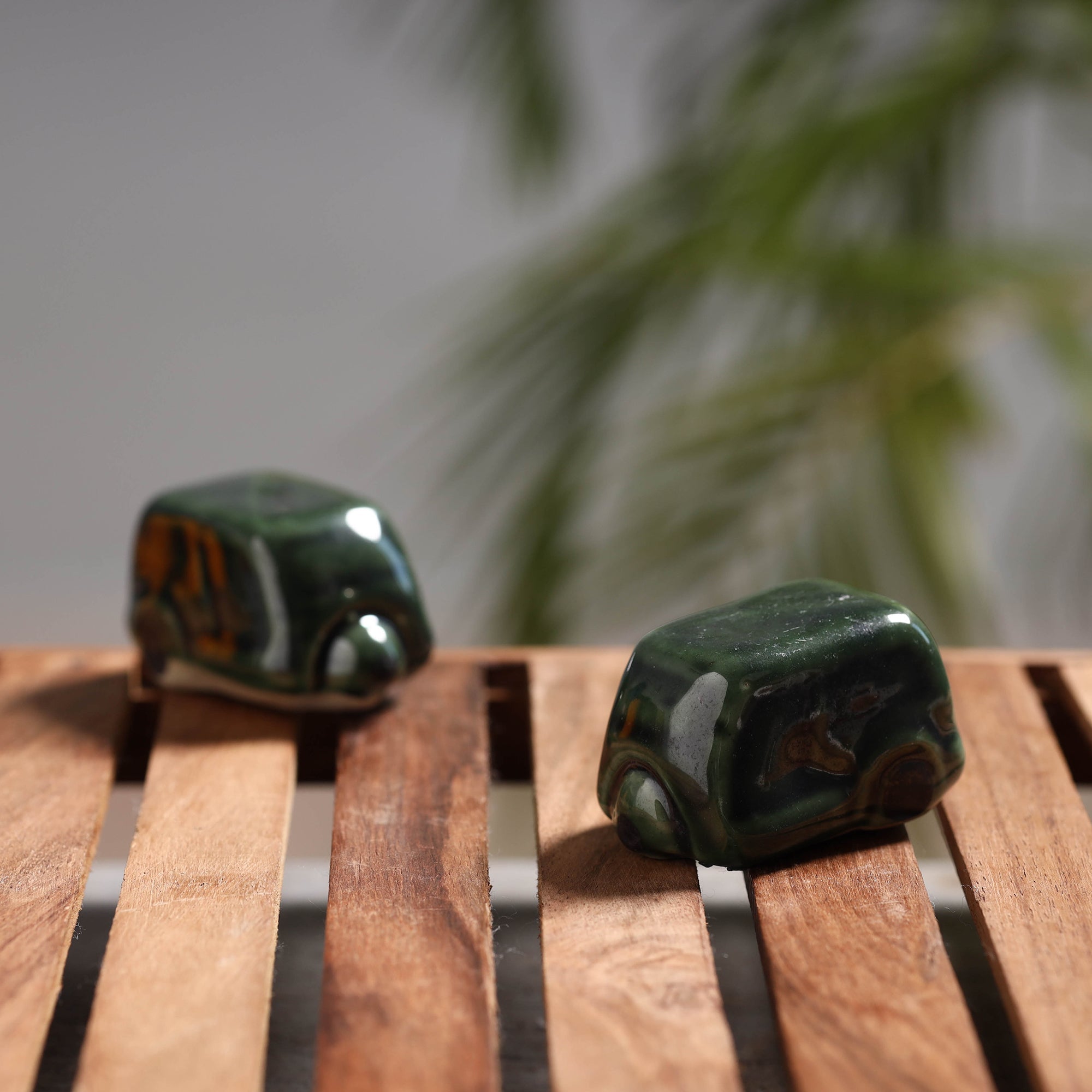 Handcrafted green ceramic toy set of two. Discover the joy of play with our handcrafted ceramic toy set. Delightful and safe, these two charming toys are meticulously crafted from high-quality ceramic, providing a unique and artistic twist to traditional playtime. Let your child's imagination soar as they explore the world of creativity and craftsmanship with these beautifully handcrafted toys.