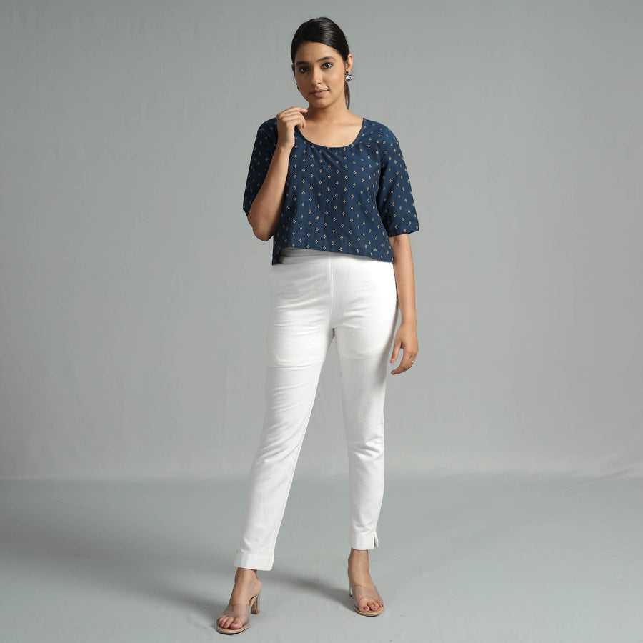 Look and feel beautiful in this uniquely designed blue jacquard half sleeve cotton crop top. Made of south pre-washed cotton fabric, this regular-fit crop top is extremely comfortable to wear all day long. This crop top is perfect for your daily outing and for a special occasion.