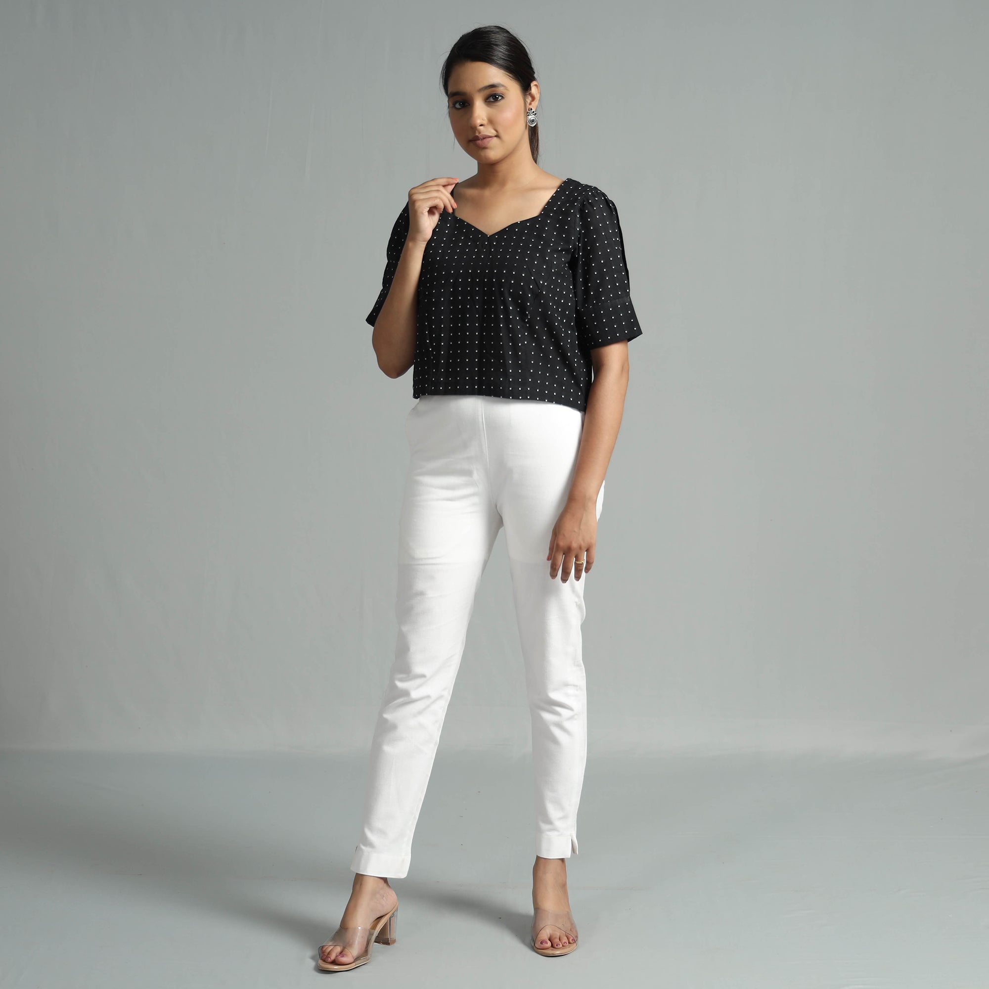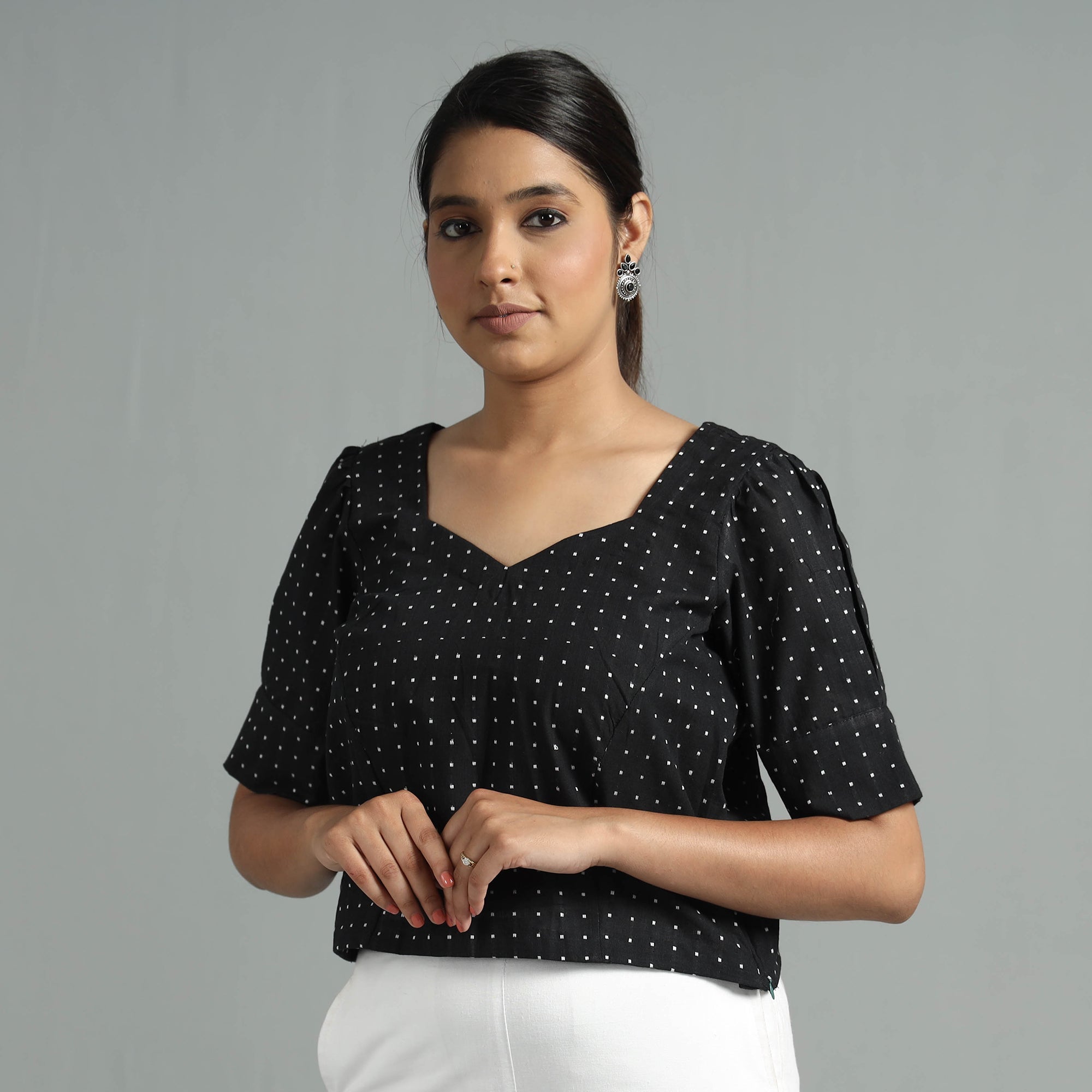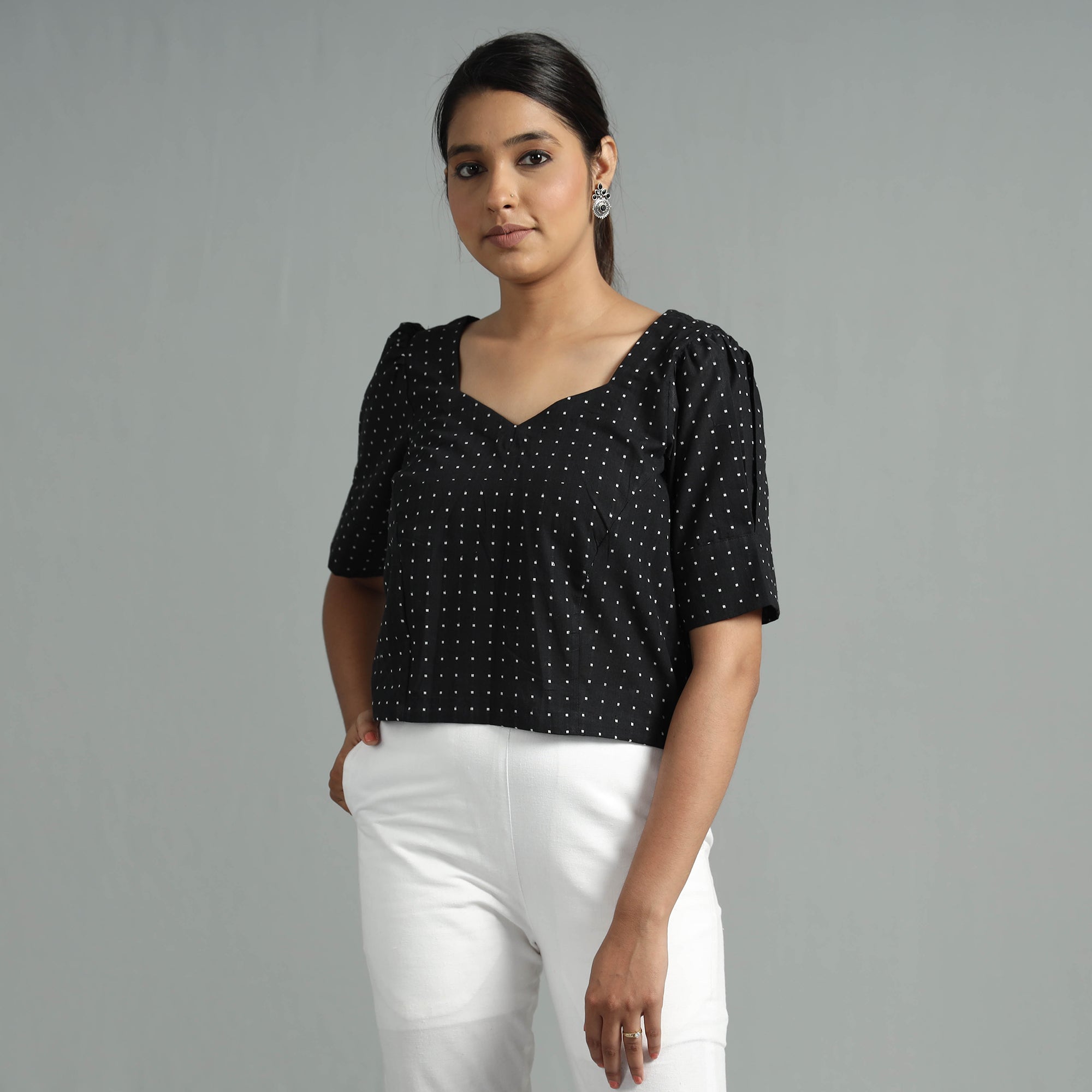 Look and feel beautiful in this uniquely designed black jacquard half sleeve cotton crop top. Made of south pre-washed cotton fabric, this regular-fit crop top is extremely comfortable to wear all day long. This crop top is perfect for your daily outing and for a special occasion.