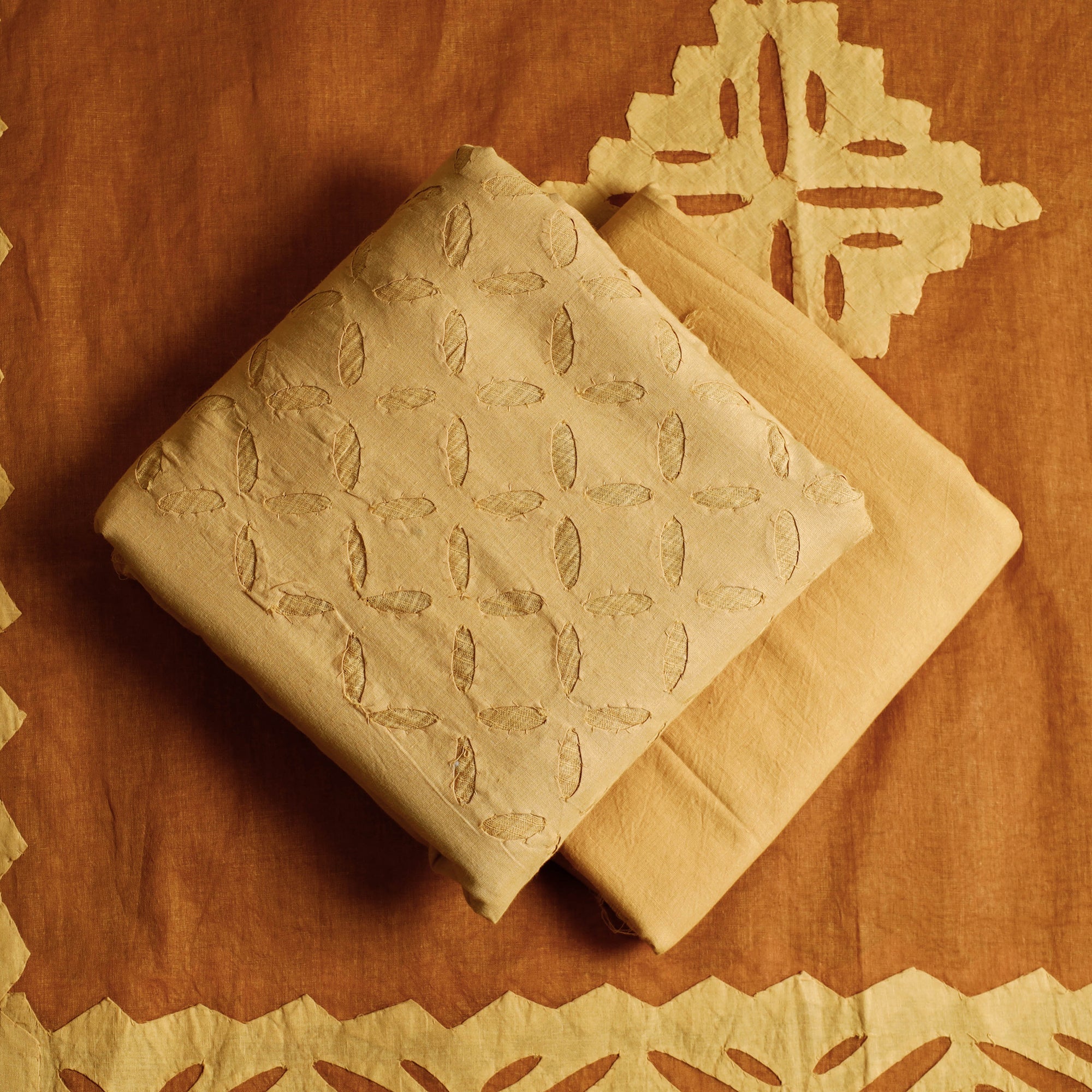 Fine qualityhand stitched yellow applique cut work cotton 3-piece dress material set from Barmer, Rajasthan. It's unique style applique work does magic in light and shade with beautiful stories and patterns. (the set comes with a plain colour matching bottom/salwar piece).