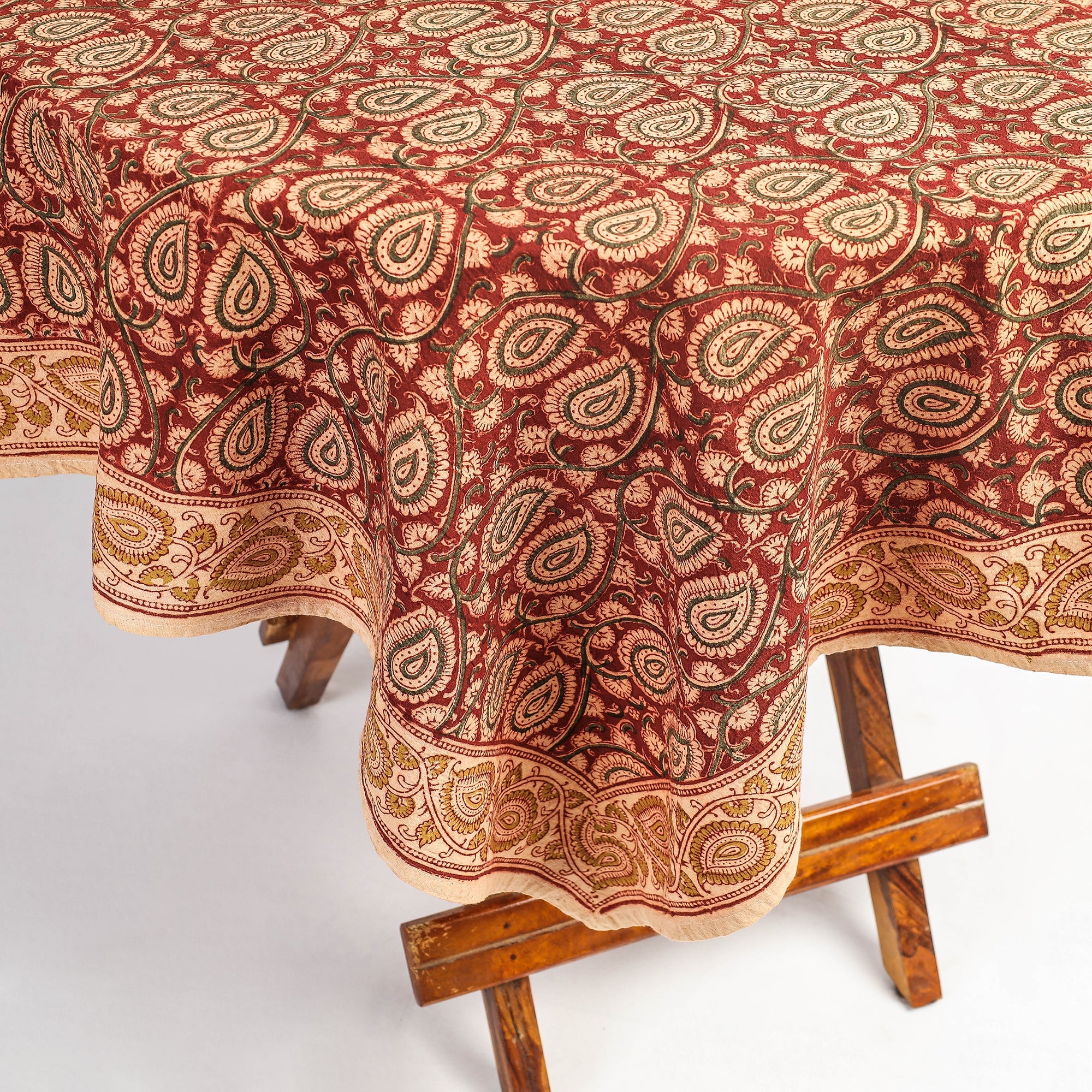 Elevate your dining experience with our red pedana kalamkari hand-block-print table cover. Meticulously crafted by skilled artisans, this fine-quality cotton cover showcases intricate designs using natural dyes. Its rich aesthetic adds a touch of elegance to any table setting, making it perfect for special occasions or everyday use.