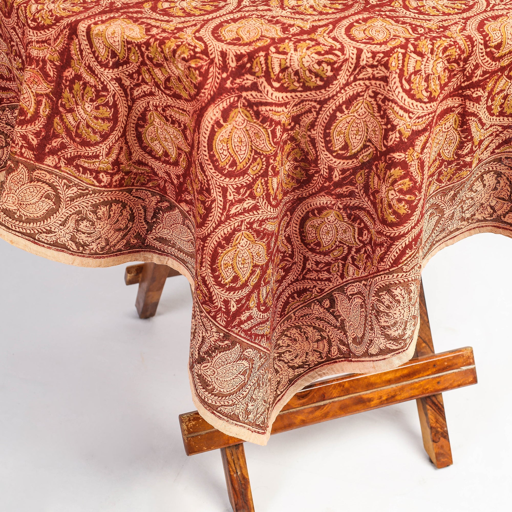 Elevate your dining experience with our red pedana kalamkari hand-block-print table cover. Meticulously crafted by skilled artisans, this fine-quality cotton cover showcases intricate designs using natural dyes. Its rich aesthetic adds a touch of elegance to any table setting, making it perfect for special occasions or everyday use.