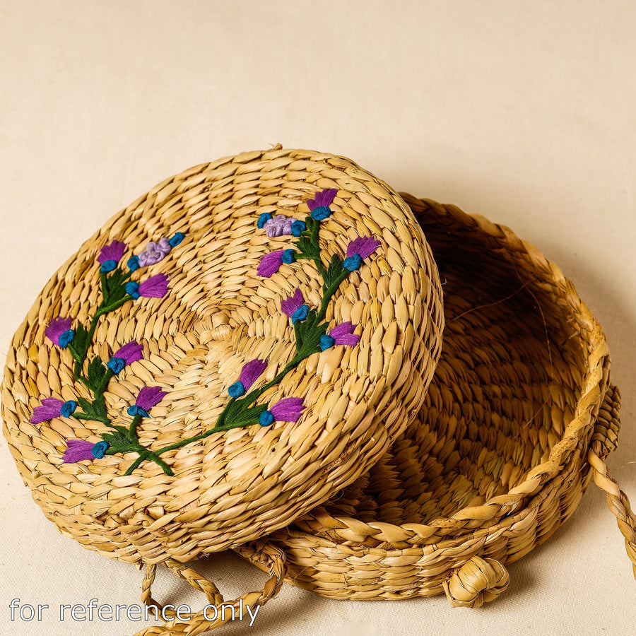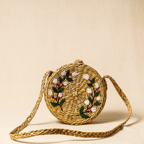 This exquisite beige handcrafted shopping sling bag from Manipur is made of natural water reed and adorned with intricate hand embroidery. The bag showcases the rich cultural heritage of Manipur, known for its traditional craftsmanship. Made from durable and eco-friendly water reed, the bag is perfect for everyday use. It offers ample space for cosmetics, makeup kits, and jewellery. The vibrant hand embroidery adds an artistic touch, depicting traditional patterns and nature-inspired designs. With a secure closure, this bag combines traditional charm with contemporary style, making it a versatile and fashionable accessory for any occasion.