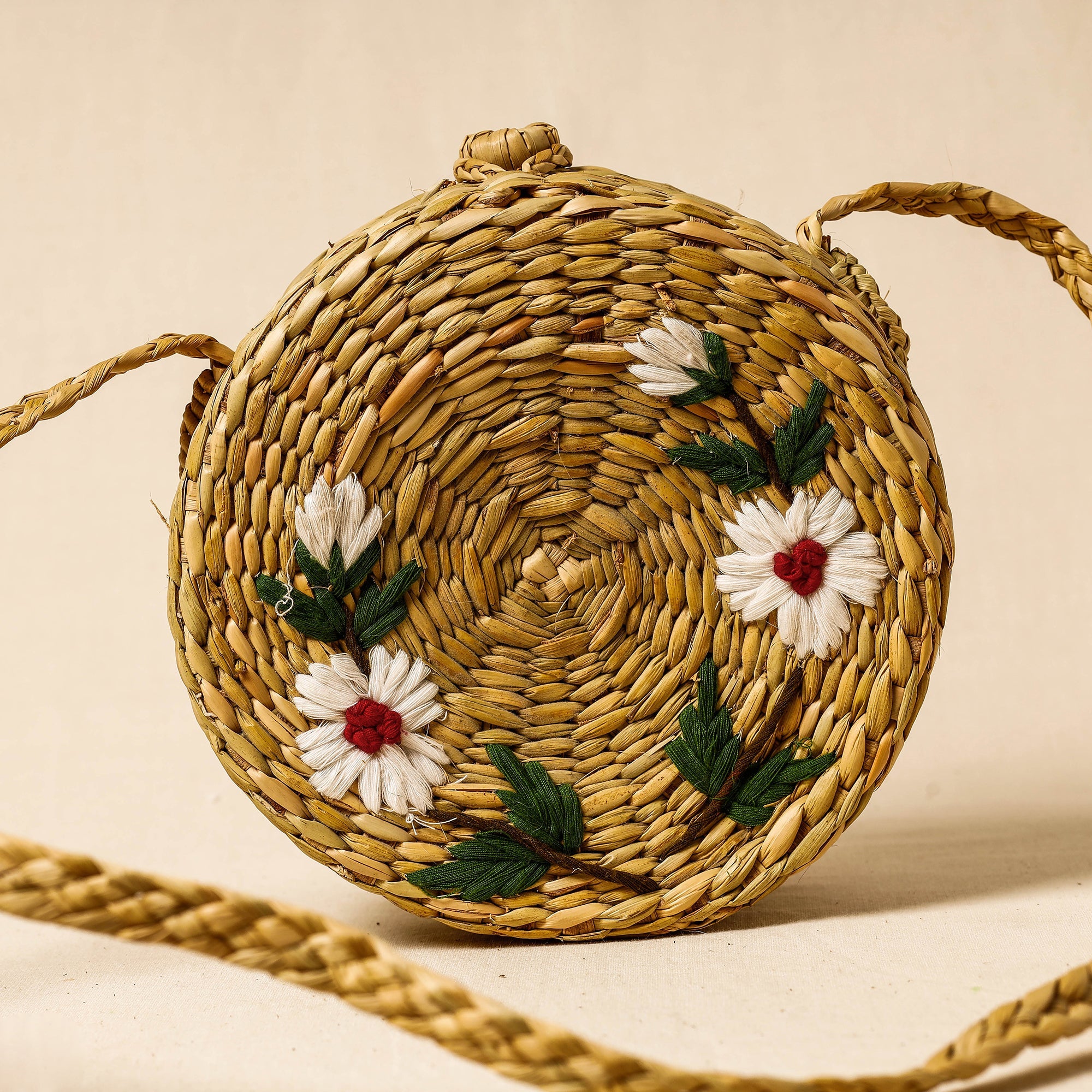 Beige - Handcrafted Natural Water Reed Embroidered Sling Bag
