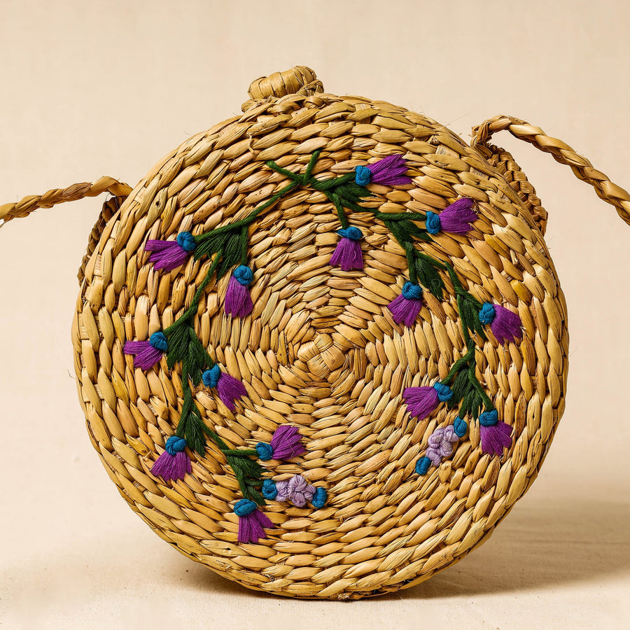 This exquisite beige handcrafted shopping sling bag from Manipur is made of natural water reed and adorned with intricate hand embroidery. The bag showcases the rich cultural heritage of Manipur, known for its traditional craftsmanship. Made from durable and eco-friendly water reed, the bag is perfect for everyday use. It offers ample space for cosmetics, makeup kits, and jewellery. The vibrant hand embroidery adds an artistic touch, depicting traditional patterns and nature-inspired designs. With a secure closure, this bag combines traditional charm with contemporary style, making it a versatile and fashionable accessory for any occasion.