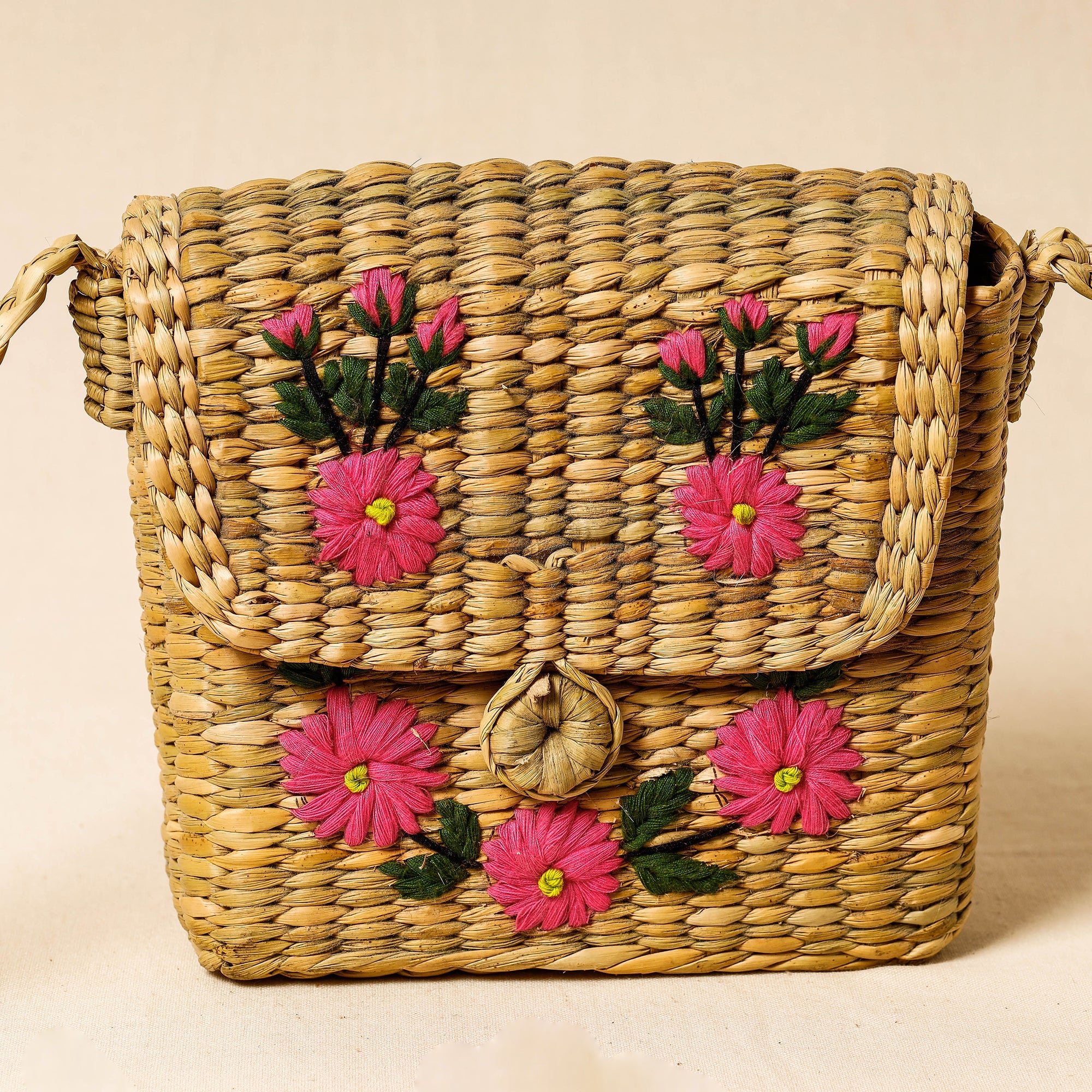 This exquisite beige handcrafted shopping sling bag from Manipur is made of natural water reed and adorned with intricate hand embroidery. The bag showcases the rich cultural heritage of Manipur, known for its traditional craftsmanship. Made from durable and eco-friendly water reed, the bag is perfect for everyday use. It offers ample . The vibrant hand embroidery adds an artistic touch, depicting traditional patterns and nature-inspired designs. With a secure closure, this bag combines traditional charm with contemporary style, making it a versatile and fashionable accessory for any occasion.