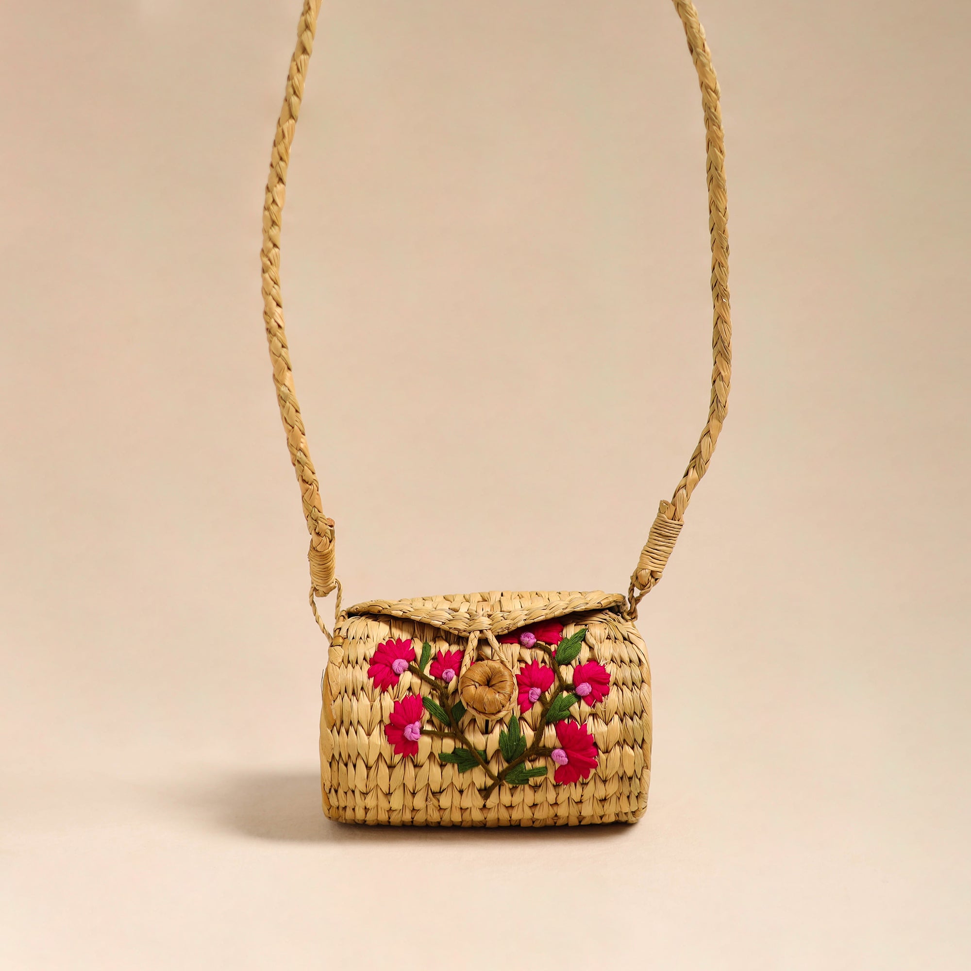 This exquisite beige handcrafted shopping dholak sling bag from Manipur is made of natural water reed and adorned with intricate hand embroidery. The bag showcases the rich cultural heritage of Manipur, known for its traditional craftsmanship. Made from durable and eco-friendly water reed, the bag is perfect for everyday use. It offers ample space for cosmetics, makeup kits, and jewellery. The vibrant hand embroidery adds an artistic touch, depicting traditional patterns and nature-inspired designs. With a secure closure, this bag combines traditional charm with contemporary style, making it a versatile and fashionable accessory for any occasion.