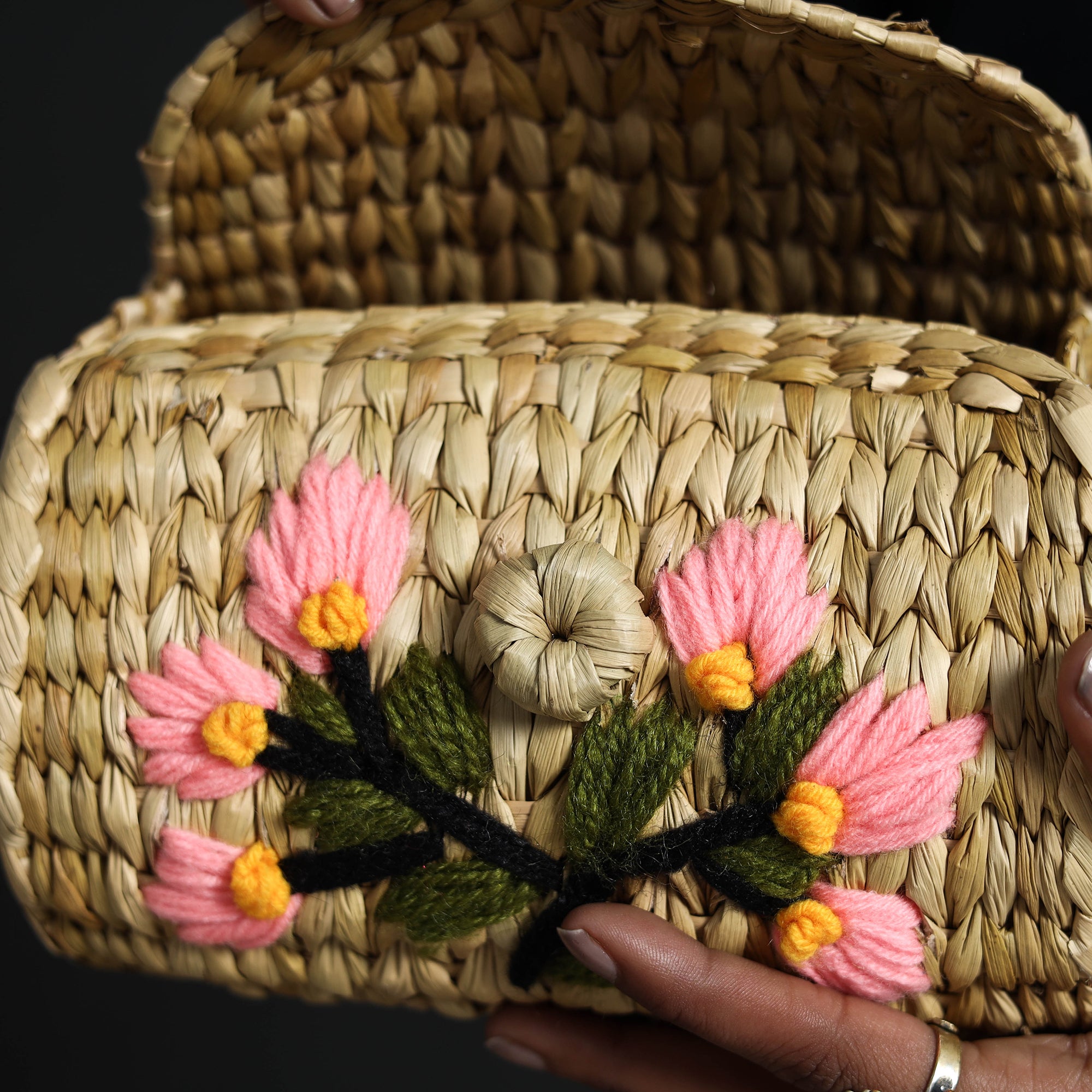 This exquisite beige handcrafted shopping dholak sling bag from Manipur is made of natural water reed and adorned with intricate hand embroidery. The bag showcases the rich cultural heritage of Manipur, known for its traditional craftsmanship. Made from durable and eco-friendly water reed, the bag is perfect for everyday use. It offers ample space for cosmetics, makeup kits, and jewellery. The vibrant hand embroidery adds an artistic touch, depicting traditional patterns and nature-inspired designs. With a secure closure, this bag combines traditional charm with contemporary style, making it a versatile and fashionable accessory for any occasion.