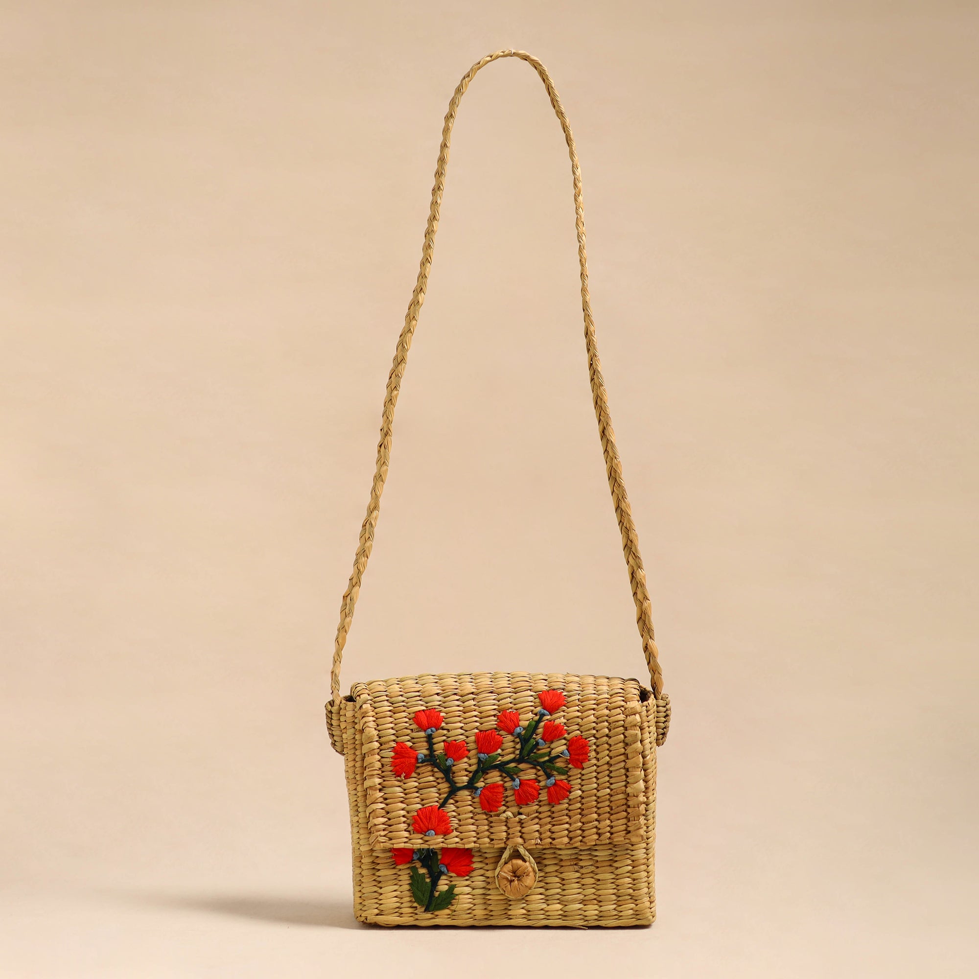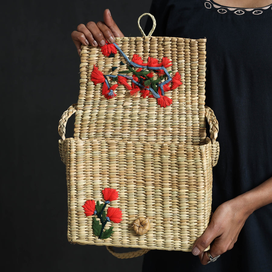 This exquisite beige handcrafted shopping sling bag from Manipur is made of natural water reed and adorned with intricate hand embroidery. The bag showcases the rich cultural heritage of Manipur, known for its traditional craftsmanship. Made from durable and eco-friendly water reed, the bag is perfect for everyday use. It offers ample . The vibrant hand embroidery adds an artistic touch, depicting traditional patterns and nature-inspired designs. With a secure closure, this bag combines traditional charm with contemporary style, making it a versatile and fashionable accessory for any occasion.