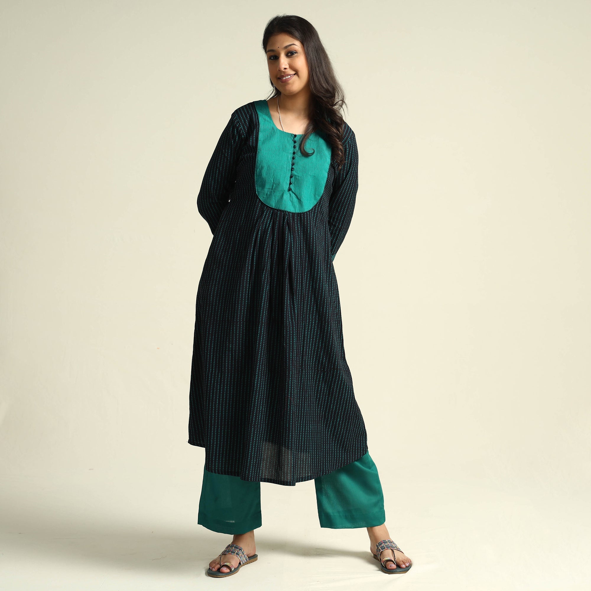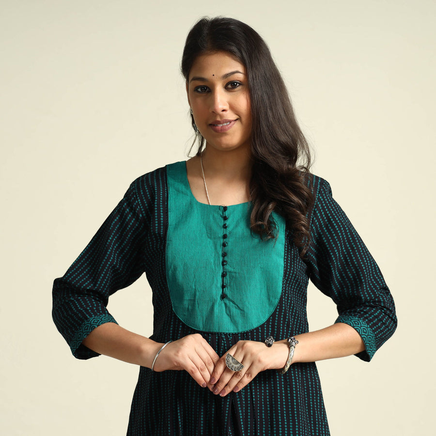 Look and feel beautiful in this uniquely designed bagh block printed cotton side pocket long kurta with palazzo set. This cotton suit makes you comfortable with ease all day long. This suit is perfect for your daily outing and for a special occasion. Bagh is a hand block printing technique from the Bagh, a small tribal town in Dhar district of Madhya Pradesh. ‘Bagh prints’ are trendy, cool and comfortable cloth material.
