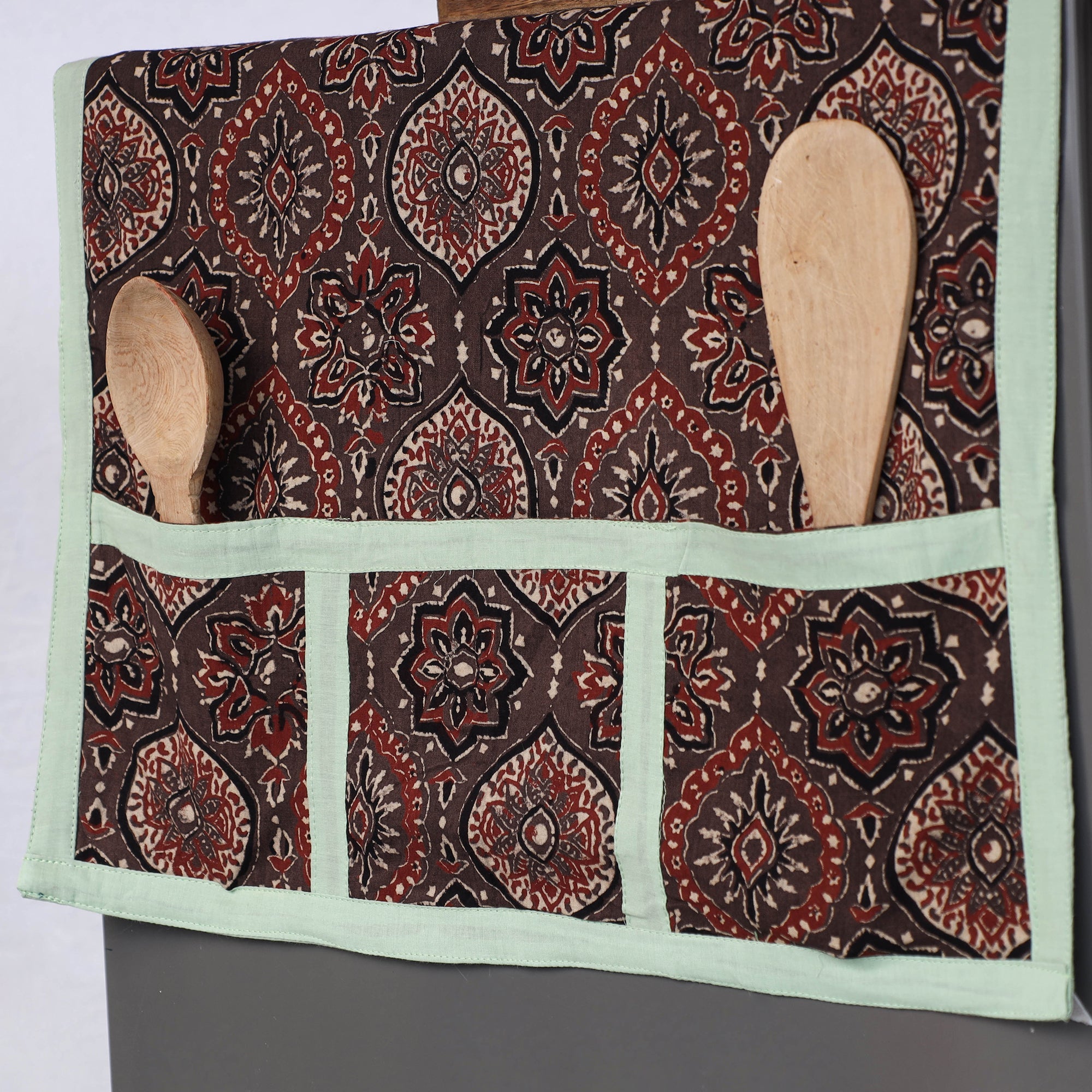 This brown ajrakh hand block-printed cotton fridge top cover is textured with handmade textiles from India. It features six utility side pockets to keep your daily essentials organized. Perfect for adding a touch of traditional Indian style to your kitchen while keeping it organized.