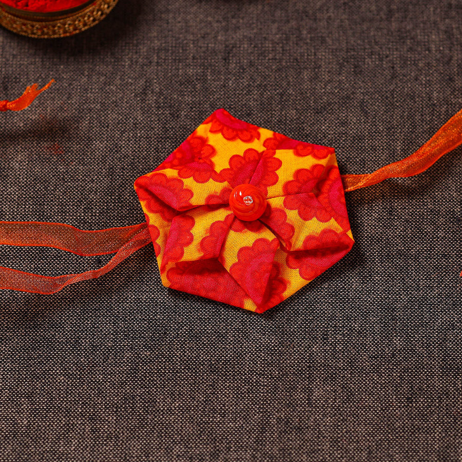 Material  Description Celebrate the joyous festival of Raksha Bandhan with this yo yo flower blue mango rakhi, handmade with love by women working at Blue Mango. This rakhi is handcrafted for the very special khatta meetha bond between brother and sister. You can also use it as a bracelet.