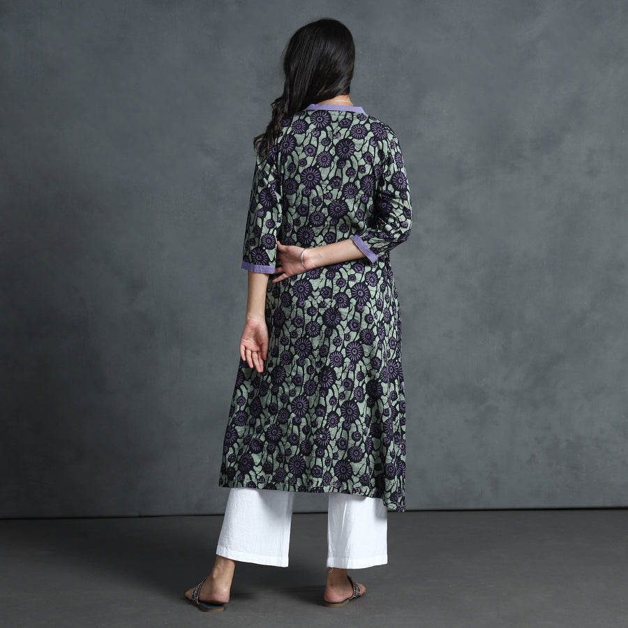 Green - Hand Embroidery Cotton A-Line Batik Print Kurta for women 04