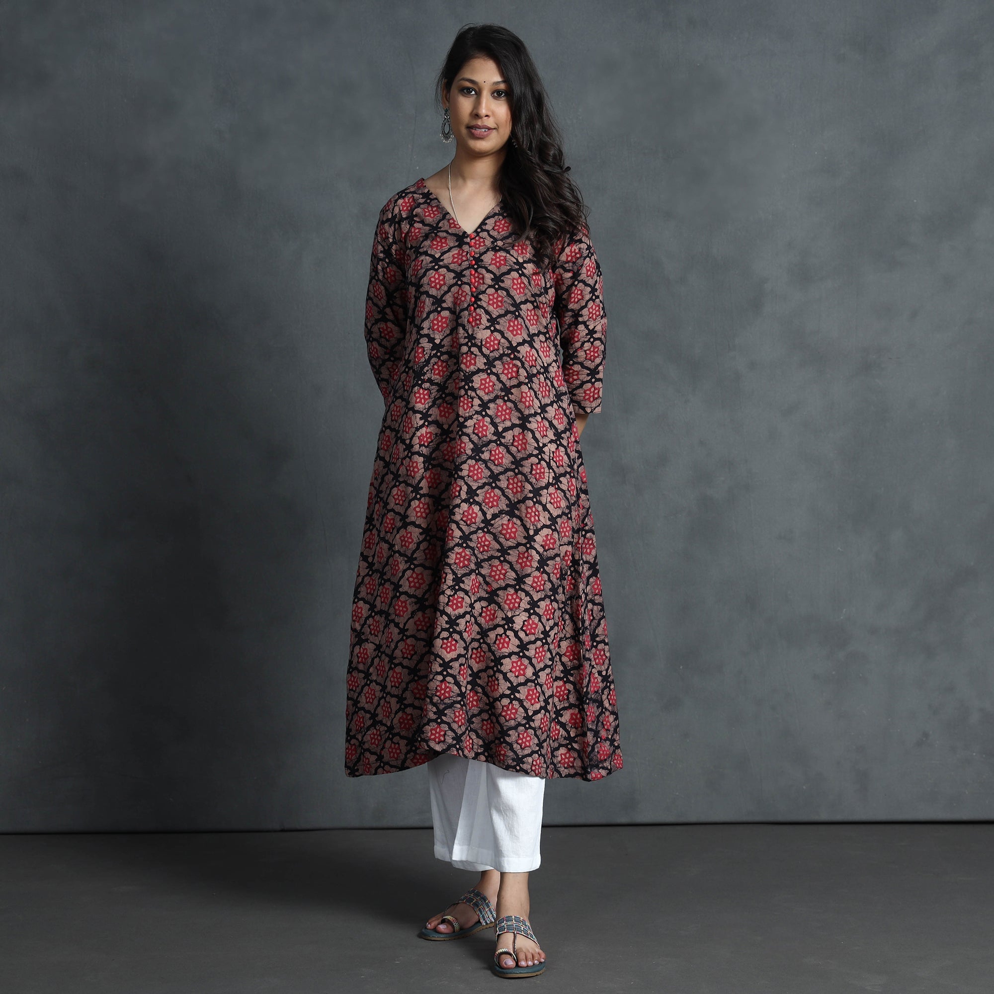 Black - Cotton Hand Block Batik Print A-Line Kurta for women 13