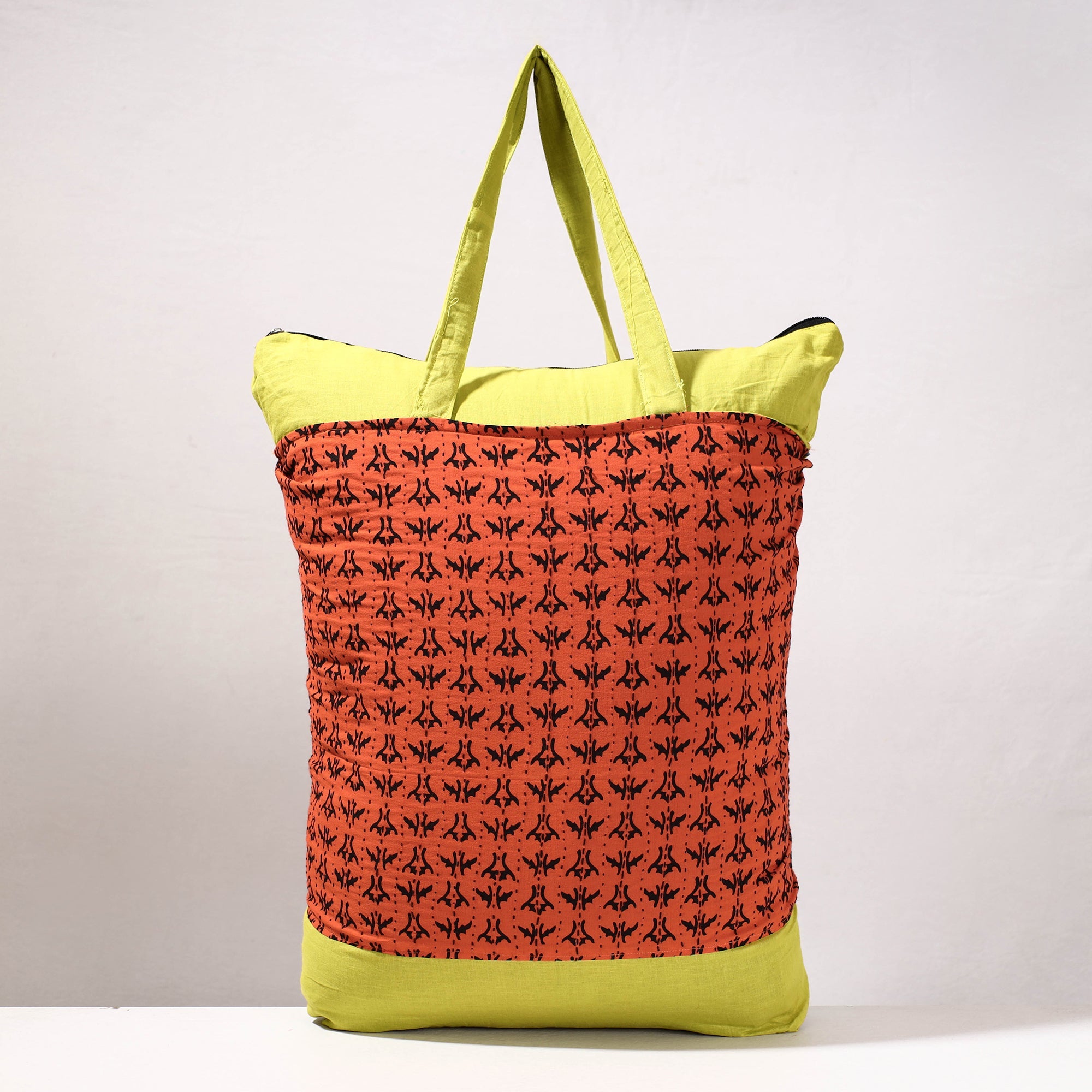 Elevate your shopping experience with our orange kantha patchwork block print cotton shopping bag. this block-printed designs add a touch of elegance and flair, making this bag a true fusion of art and utility.