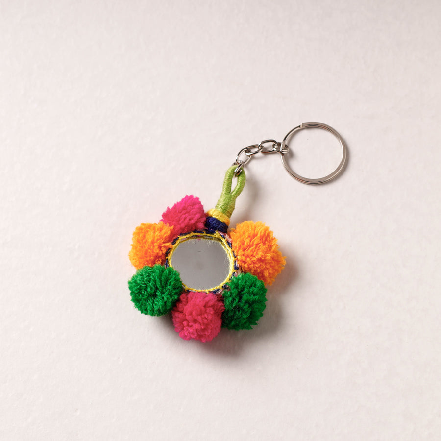 Keychain made up of multicolor patwa thread craft along with seashells at the bottom, handcrafted by Vishnu Kumar Patwa. Patwa is a thread craft that originated in Rajasthan and is now practised in parts of Rajasthan. The Patwa community has been making traditional jewellery and accessories for women with thick weaves of thread in Rajasthan.