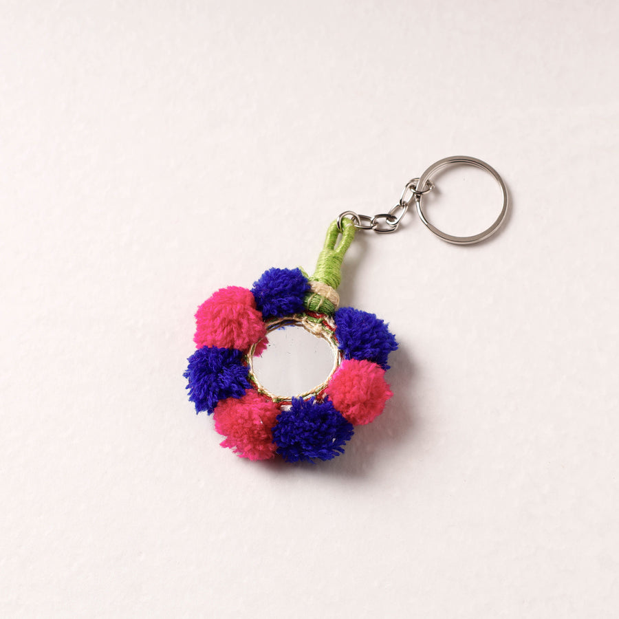Keychain made up of multicolor patwa thread craft along with seashells at the bottom, handcrafted by Vishnu Kumar Patwa. Patwa is a thread craft that originated in Rajasthan and is now practised in parts of Rajasthan. The Patwa community has been making traditional jewellery and accessories for women with thick weaves of thread in Rajasthan.