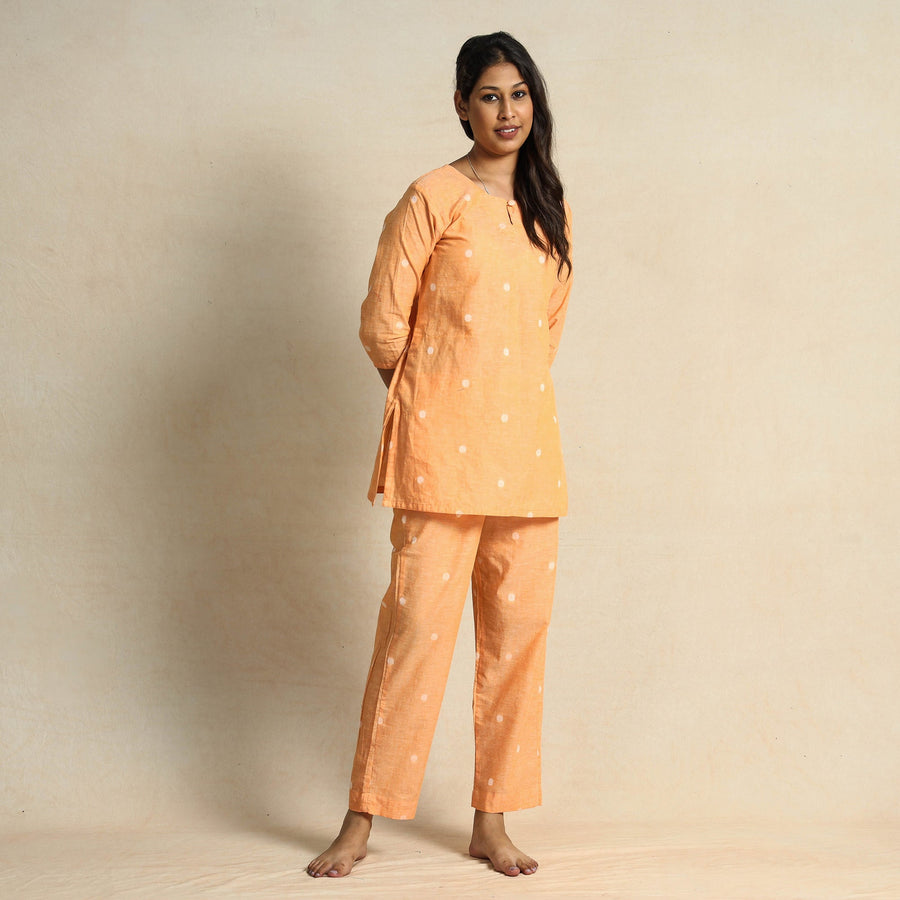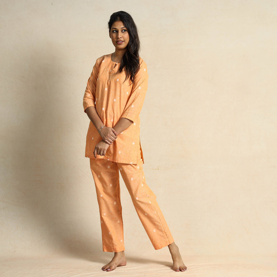 This jacquard top and pyjama night suit set is crafted from jacquard weave cotton fabric. The cotton fabric ensures a comfortable night's sleep. The pyjama features an elasticated waist and two side pockets for added convenience. The night suit will give you the freedom to customsize the fit to suit your unique shape. This night suit is beautiful and skin-friendly, and it allows you to move and sleep with ease and comfort.