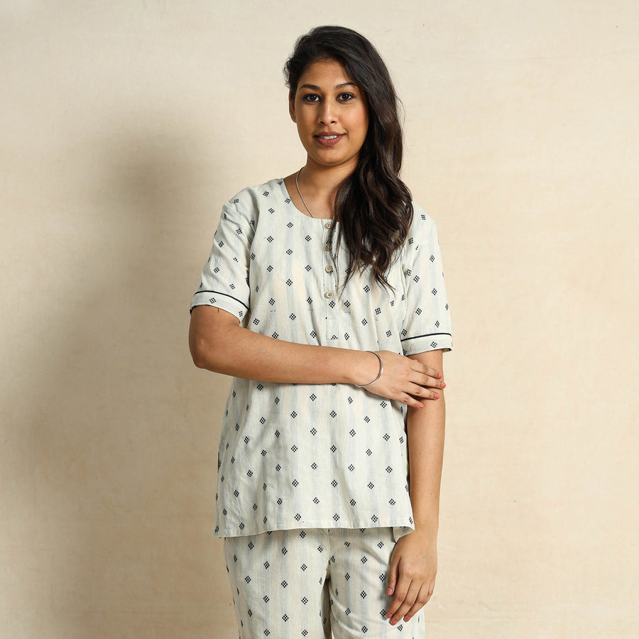 This jacquard top and pyjama night suit set is crafted from jacquard weave cotton fabric. The cotton fabric ensures a comfortable night's sleep. The pyjama features an elasticated waist and two side pockets for added convenience. The night suit will give you the freedom to customsize the fit to suit your unique shape. This night suit is beautiful and skin-friendly, and it allows you to move and sleep with ease and comfort.