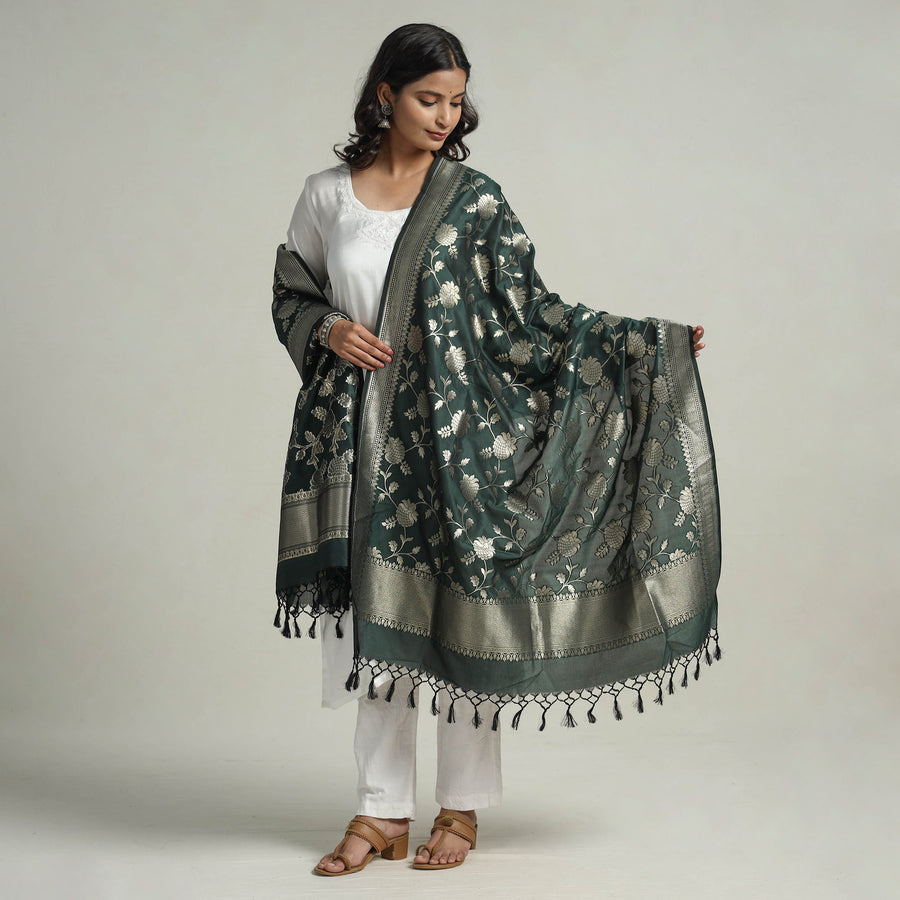 • Green - banarasi semi silk zari jaal dupatta with tassels
