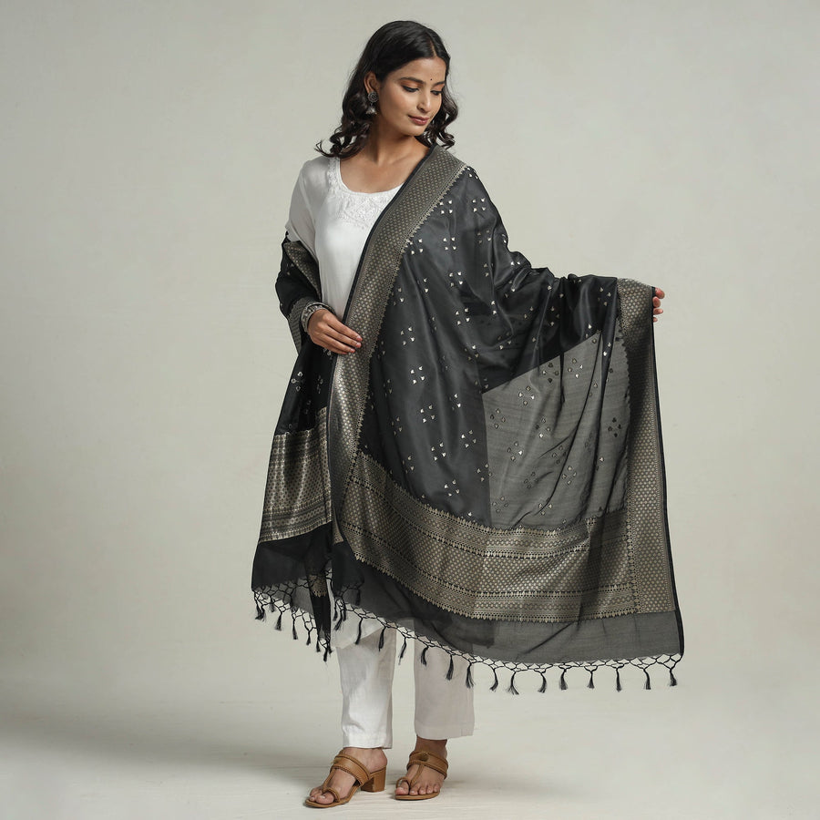 This exquisite banarasi semi silk zari jaal dupatta with tassels is a stunning addition to your wardrobe. The intricate floral zari jaal pattern adds a touch of elegance and grace to the rich dupatta. Adorned with delicate tassels, this dupatta is the perfect accessory to elevate your traditional attire. Its lightweight and semi-silk texture ensure comfort while exuding a regal charm. With its blend of traditional and contemporary style, this dupatta is a must-have accessory for a glamorous look.
